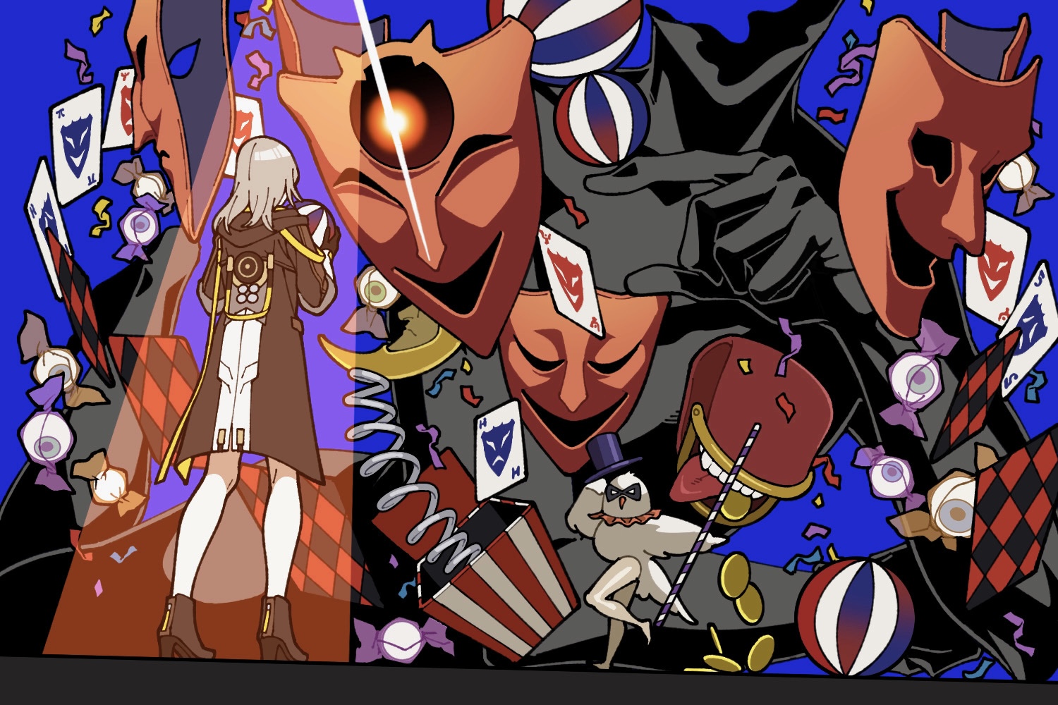 1girl 1other aha_(honkai:_star_rail) ball black_jacket black_skin blue_background candy_wrapper card colored_skin confetti eyeball grey_hair honkai:_star_rail honkai_(series) jacket kabeuchi_1105 mask medium_hair pointing pointing_at_another spotlight stelle_(honkai:_star_rail) trailblazer_(honkai:_star_rail)