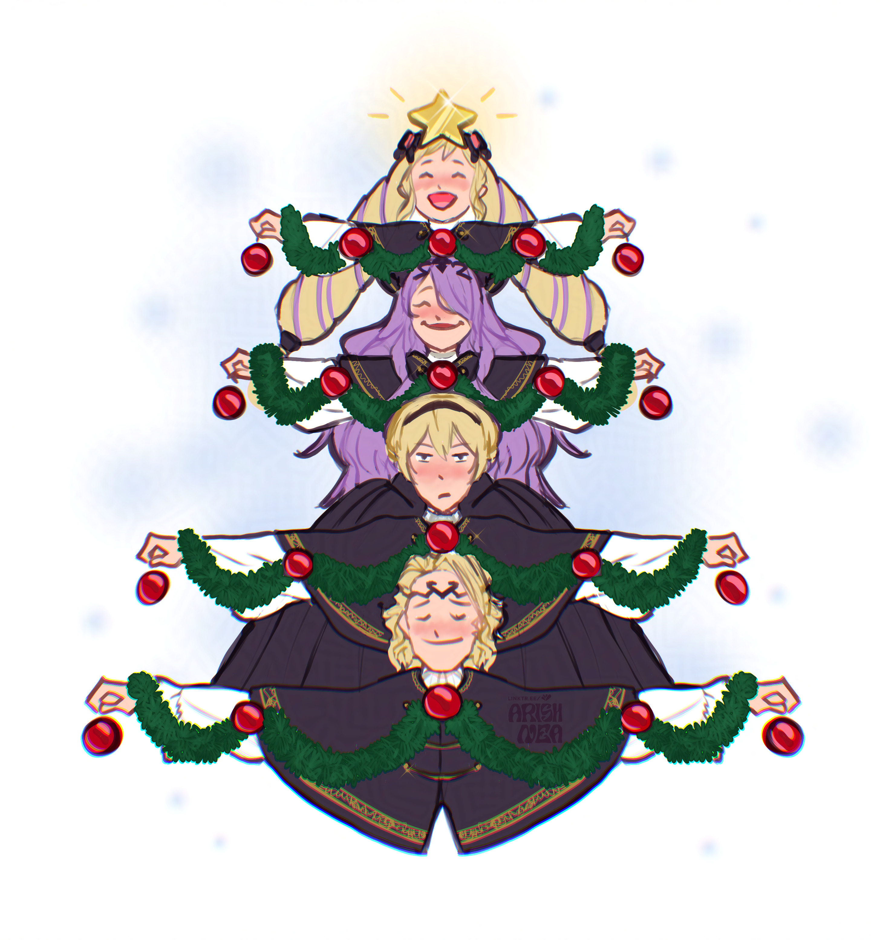 2boys 2girls absurdres blonde_hair blush camilla_(fire_emblem) christmas christmas_ornaments elise_(fire_emblem) embarrassed facing_viewer fire_emblem fire_emblem_fates happy highres leo_(fire_emblem_fates) long_hair looking_at_viewer multiple_boys multiple_girls nerinea nintendo open_mouth purple_hair short_hair siblings smile twintails xander_(fire_emblem)