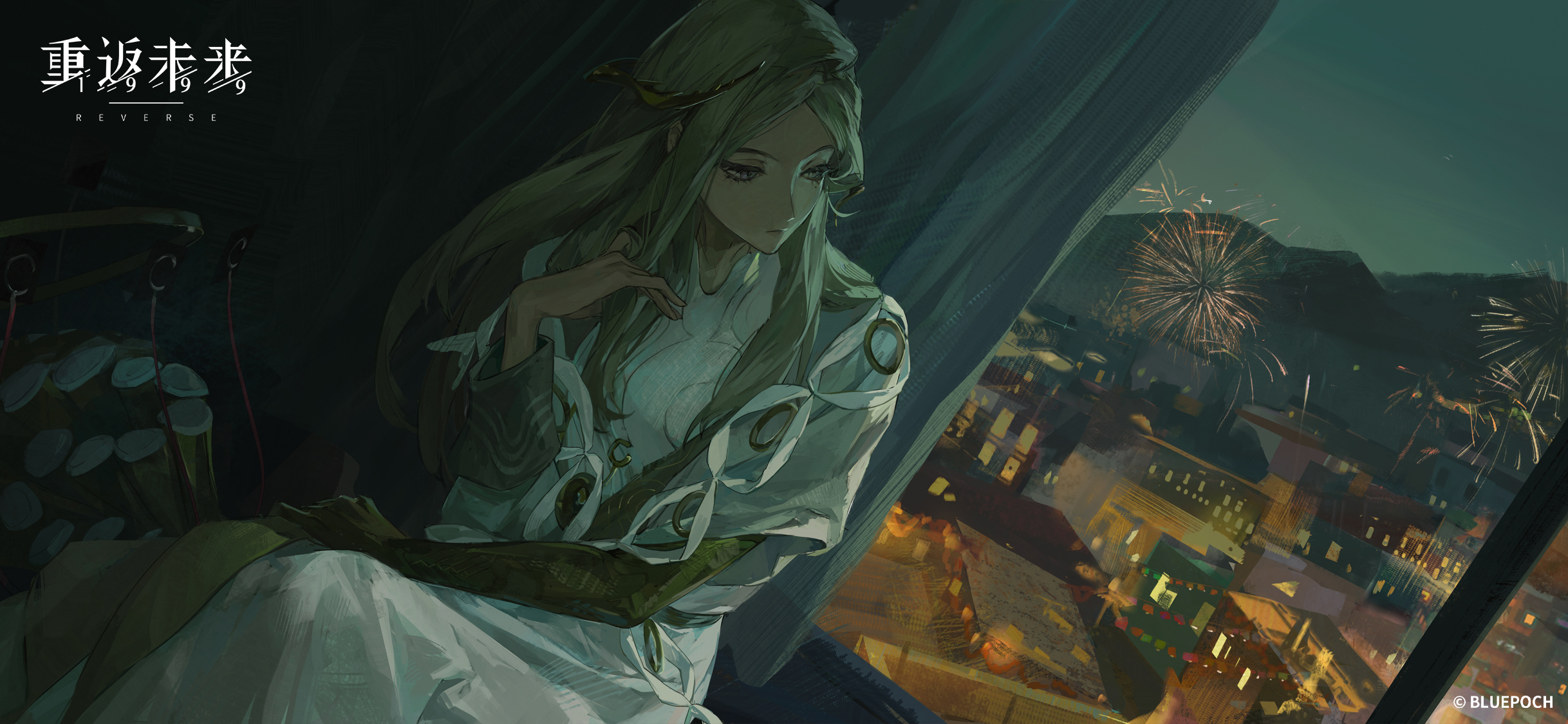 1girl adjusting_hair building city city_lights copyright_name copyright_notice curtains dutch_angle elbow_gloves fireworks gloves grey_eyes grey_hair hair_ornament hand_up highres indoors logo long_hair looking_down looking_outside looking_to_the_side lorentz_butterfly mountain night official_art official_wallpaper reverse:1999 shirt single_elbow_glove sitting solo upper_body white_shirt window yellow_gloves