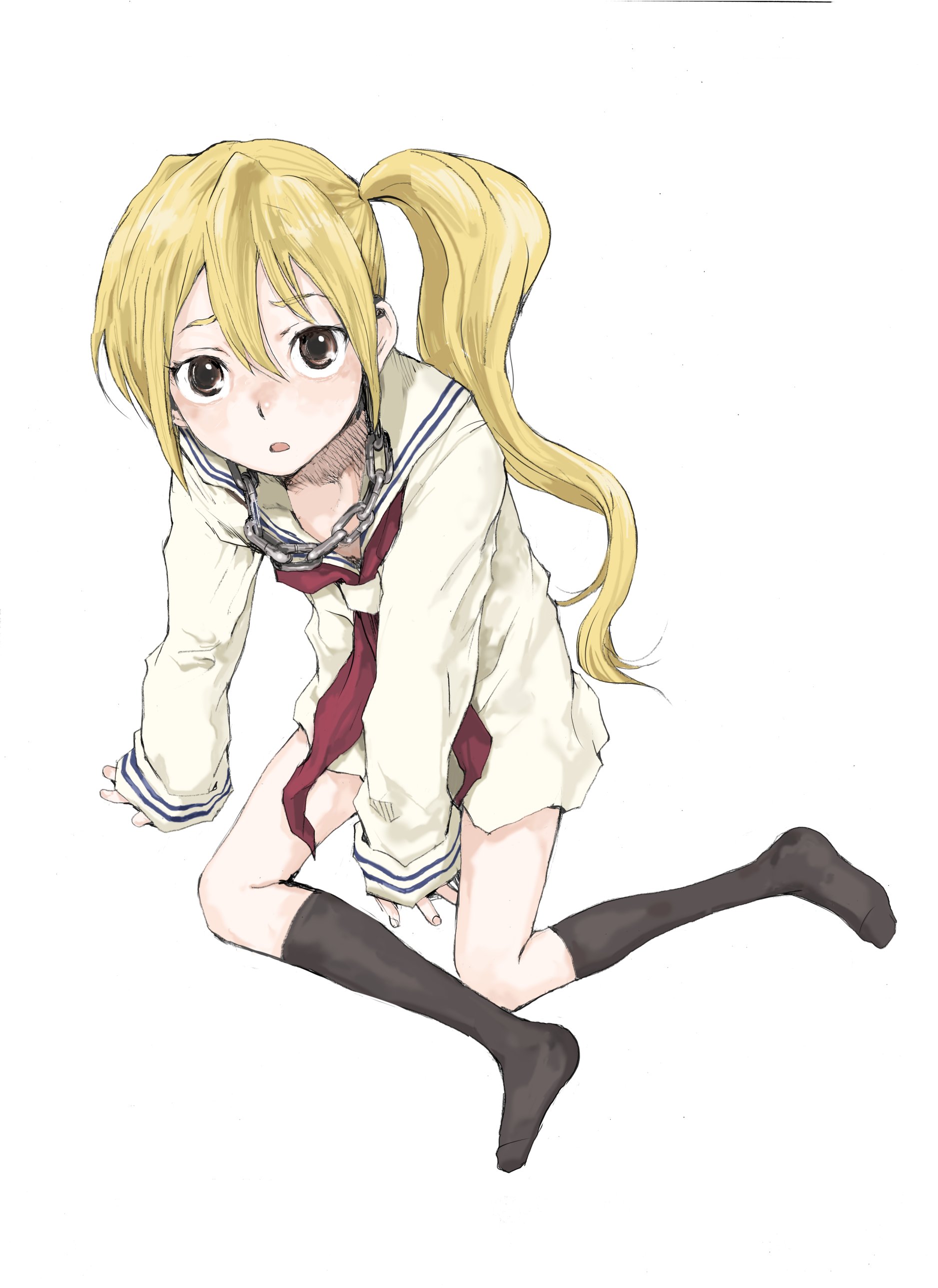 1girl absurdres blonde_hair blush brown_eyes chain highres long_hair miyamoto_iroha revision school_uniform serafuku side_ponytail socks solo sumomomo_momomo tamaoki_benkyou