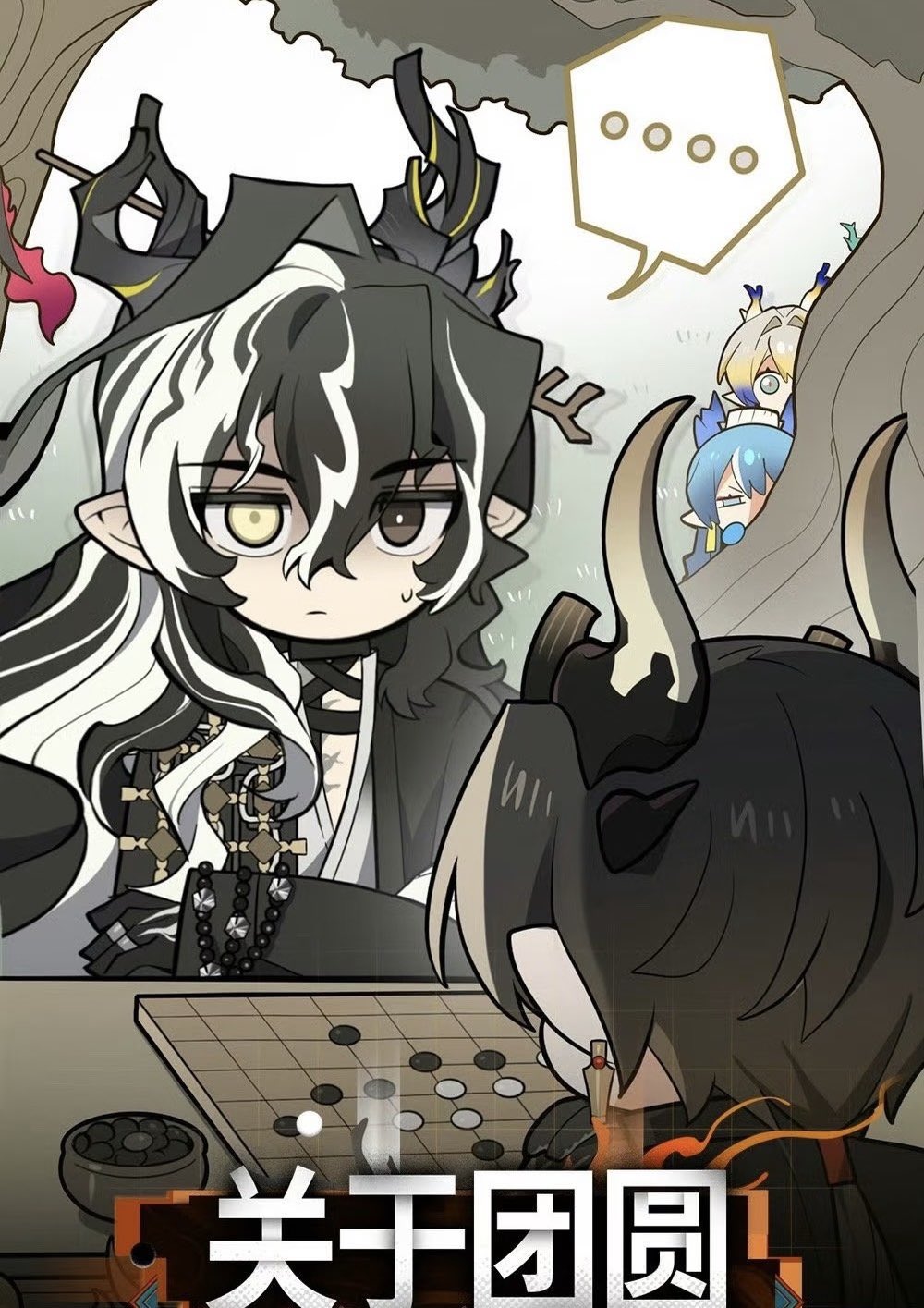 2boys 2girls antlers arknights black_hair blonde_hair blue_hair board_game brown_eyes chibi chibi_only chinese_text chongyue_(arknights) dragon_boy dragon_horns dragon_tail go_(board_game) grey_eyes heterochromia highres horns ling_(arknights) long_hair looking_at_another male_focus medium_hair multicolored_hair multiple_boys multiple_girls official_art peeking_out pointy_ears shu_(arknights) sweatdrop tail third-party_source wang_(arknights) wavy_hair white_hair yellow_eyes yu_(arknights)