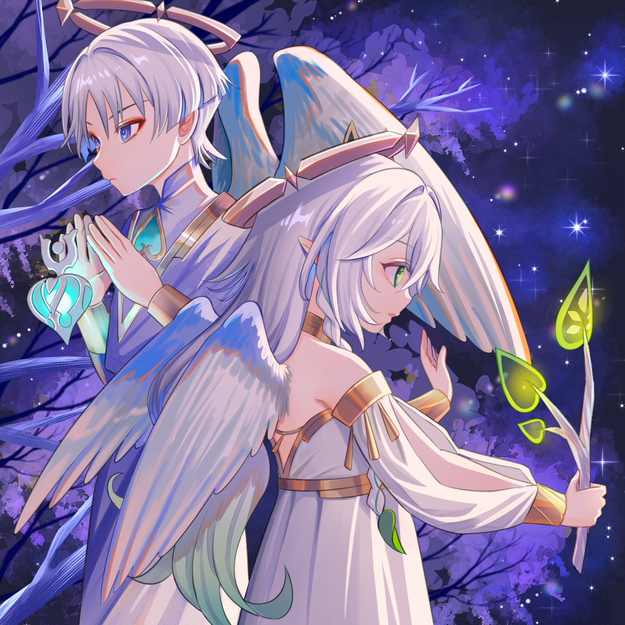 1boy 1girl alternate_costume angel_wings blue_eyes braid branch caramelo_game closed_mouth commentary_request cosplay cross-shaped_pupils detached_sleeves from_side genshin_impact gold_trim gradient_hair green_eyes green_hair halo hands_up highres holding holding_branch long_hair multicolored_hair nahida_(genshin_impact) parted_lips pointy_ears rukkhadevata_(genshin_impact) rukkhadevata_(genshin_impact)_(cosplay) scaramouche_(genshin_impact) sleeveless symbol-shaped_pupils very_long_hair wanderer_(genshin_impact) white_hair white_sleeves white_wings wings