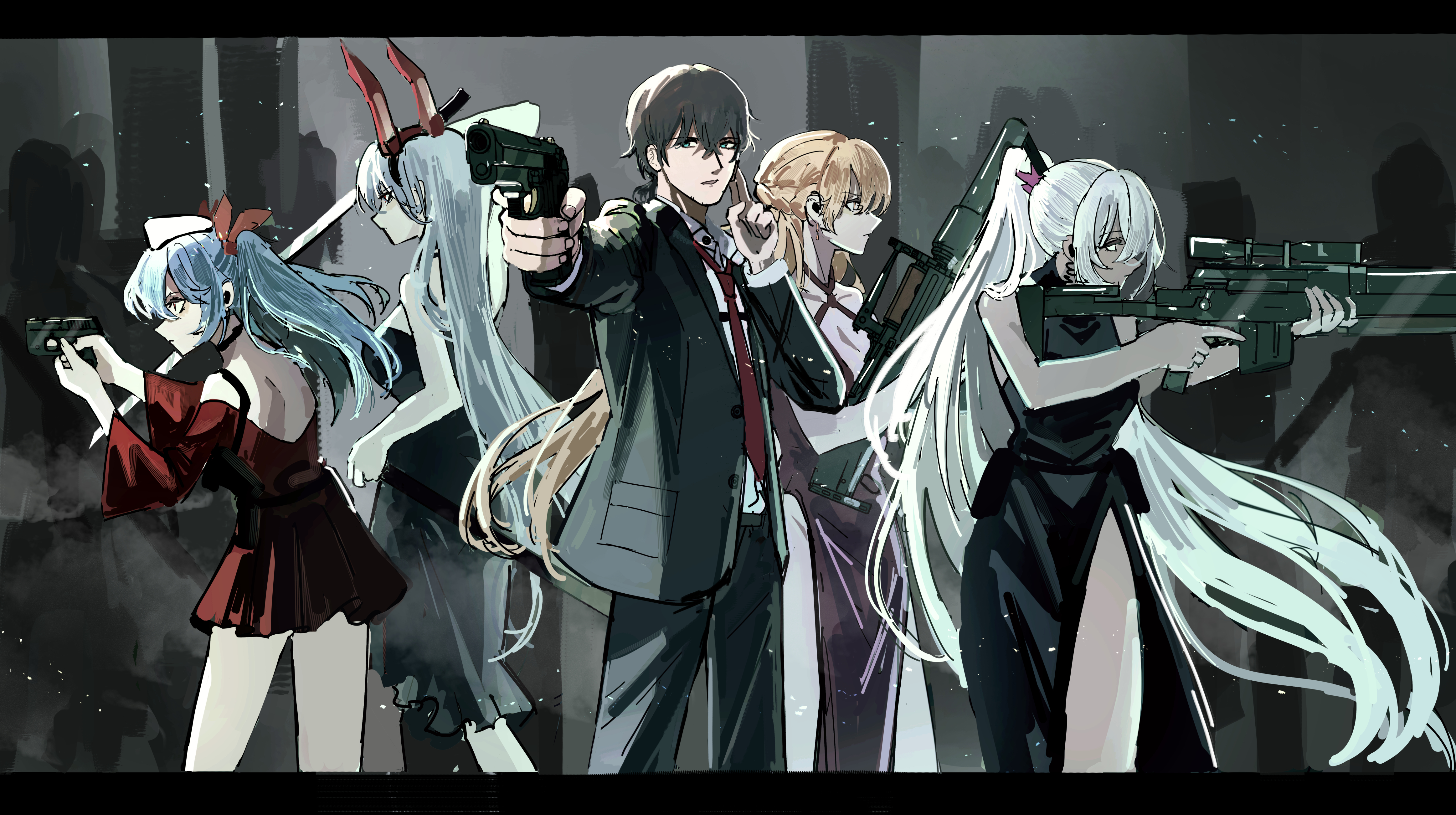 1boy 4girls absurdres aiming alternate_costume animal_ears anti-materiel_rifle assault_rifle black_dress black_hair black_pants black_suit blonde_hair blue_eyes blue_hair bolt_action braid braided_twintails breasts bullpup colphne_(girls'_frontline_2) commander_(girls'_frontline) dark-skinned_female dark_skin dress earpiece earrings fake_animal_ears feet_out_of_frame finger_on_trigger formal_clothes girls'_frontline girls'_frontline_2:_exilium groza_(girls'_frontline_2) gun handgun hat high_ponytail highres holding holding_gun holding_sword holding_weapon jewelry krolik_(girls'_frontline_2) long_hair long_sleeves mechanical_ears medium_breasts medium_hair multiple_girls necktie nemesis_(girls'_frontline_2) off_shoulder official_alternate_costume ots-14_(girls'_frontline) ots-14_(ruler_of_the_banquet)_(girls'_frontline) ots-14_groza pale_skin pants ponytail purple_dress rabbit_ears red_dress red_necktie red_ribbon ribbon rifle scope shino_duka shirt short_dress short_hair side_slit sig_san_511 single_earring sniper_rifle suit suppressor sword taurus_curve thighs twintails weapon white_hair white_hat white_shirt wide_sleeves yellow_eyes