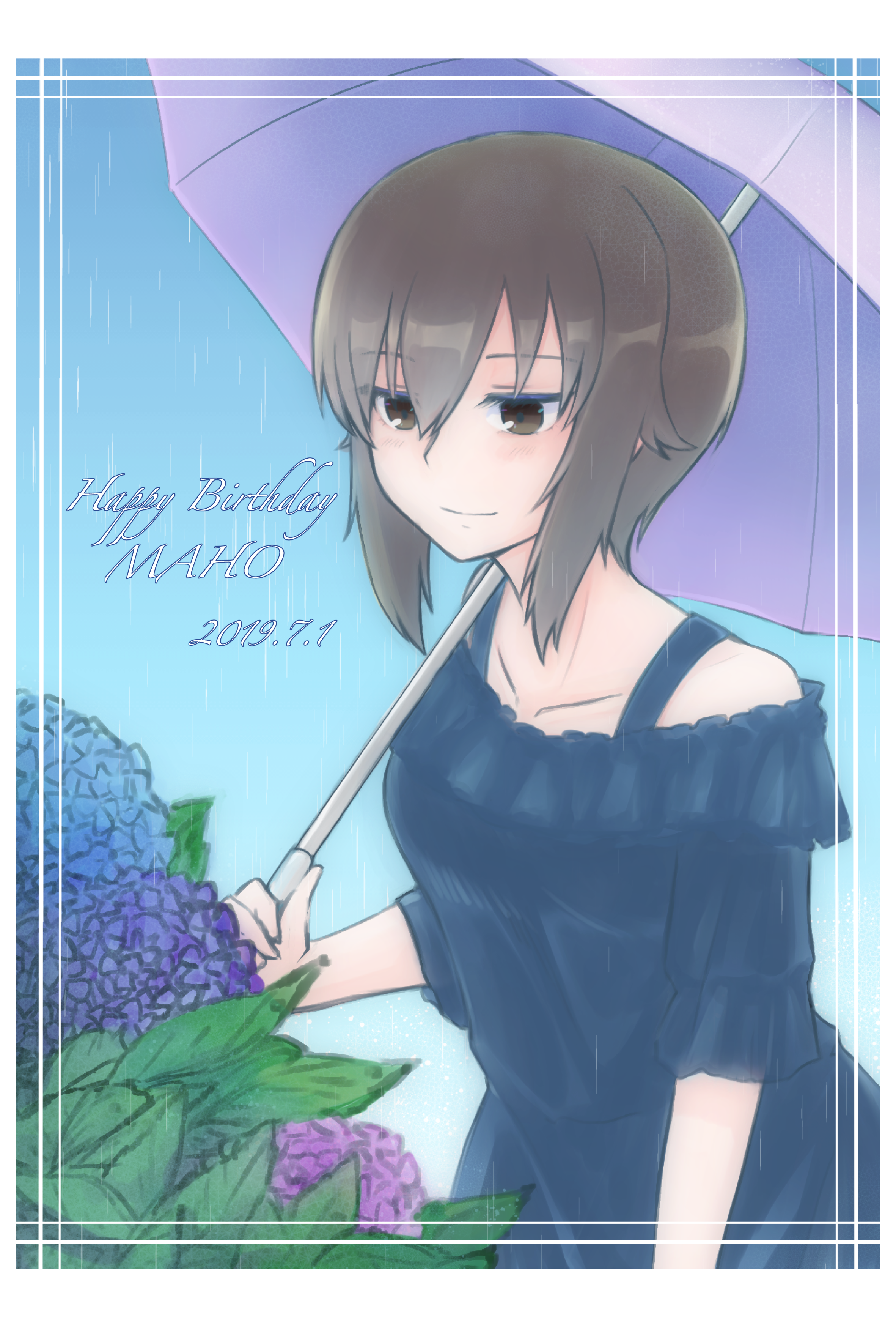1girl absurdres blue_dress bra_strap brown_eyes brown_hair dated dress flower girls_und_panzer hair_between_eyes happy_birthday highres holding holding_umbrella miaunelmia nishizumi_maho off-shoulder_dress off_shoulder short_hair short_sleeves smile solo umbrella