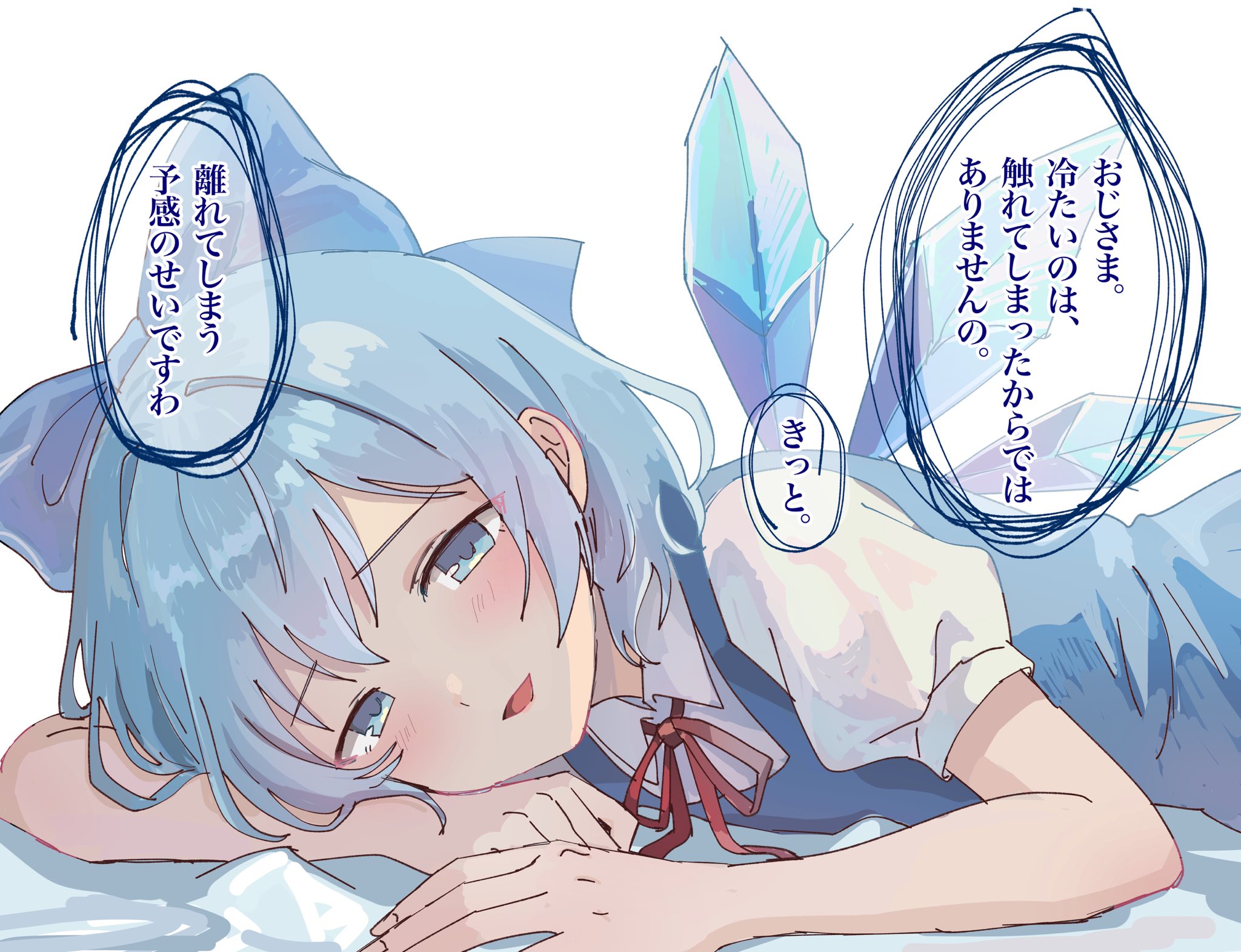 1girl blue_bow blue_dress blue_eyes blue_hair blush bow cirno commentary dress fairy hair_between_eyes highres ice ice_wings looking_at_viewer lying makida_16 medium_hair on_stomach parted_lips shirt short_sleeves smile solo speech_bubble touhou translation_request white_background white_shirt wings