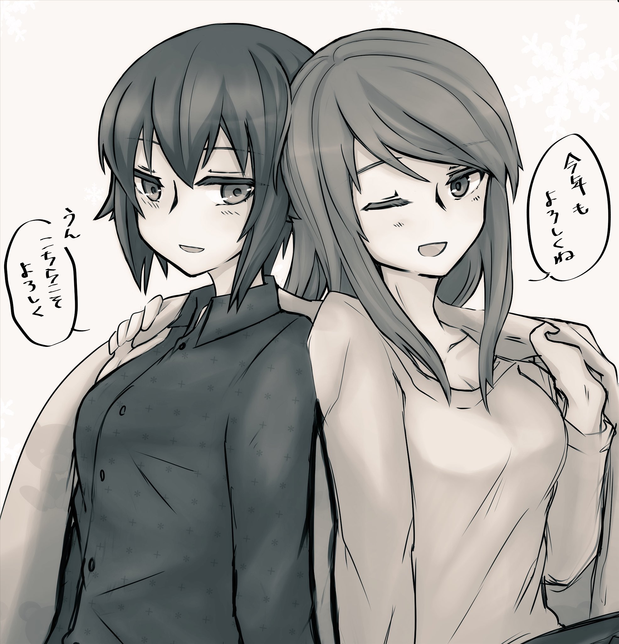 2girls ;d black_pants blue_shirt brown_eyes brown_hair girls_und_panzer greyscale highres long_hair long_sleeves looking_at_viewer miaunelmia mika_(girls_und_panzer) monochrome multiple_girls nishizumi_maho one_eye_closed open_mouth pants red_shirt shirt short_hair sitting smile speech_bubble yuri