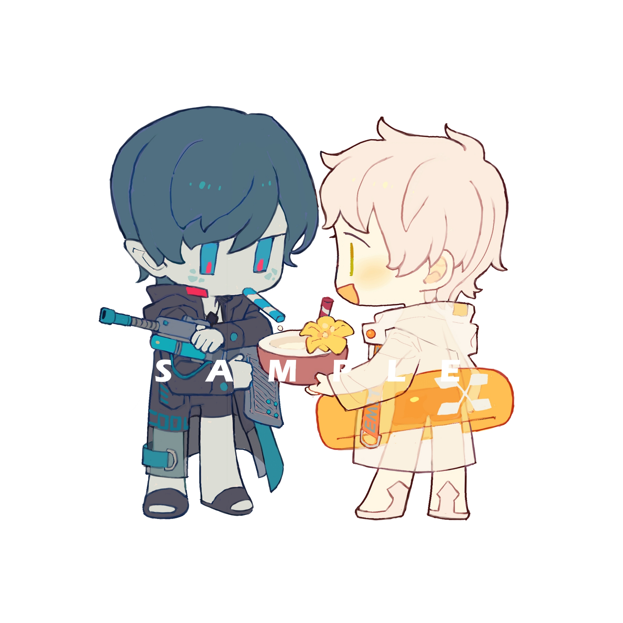 2boys arknights black_coat black_sandals black_shorts blue_eyes chibi chibi_only chinese_commentary coat coconut coconut_cup colored_skin commentary_request drinking_straw drinking_straw_in_mouth faust_(arknights) flower fruit_as_cup green_eyes green_hair grey_skin highres holding holding_water_gun hood hood_down hooded_coat innertube long_sleeves male_focus mephisto_(arknights) multiple_boys open_clothes open_coat open_mouth pointy_ears red_pupils sample_watermark sandals scales see-through_clothes see-through_coat short_hair shorts simple_background smile soko swim_ring tareme tsurime water_gun watermark white_background white_coat white_hair yellow_flower