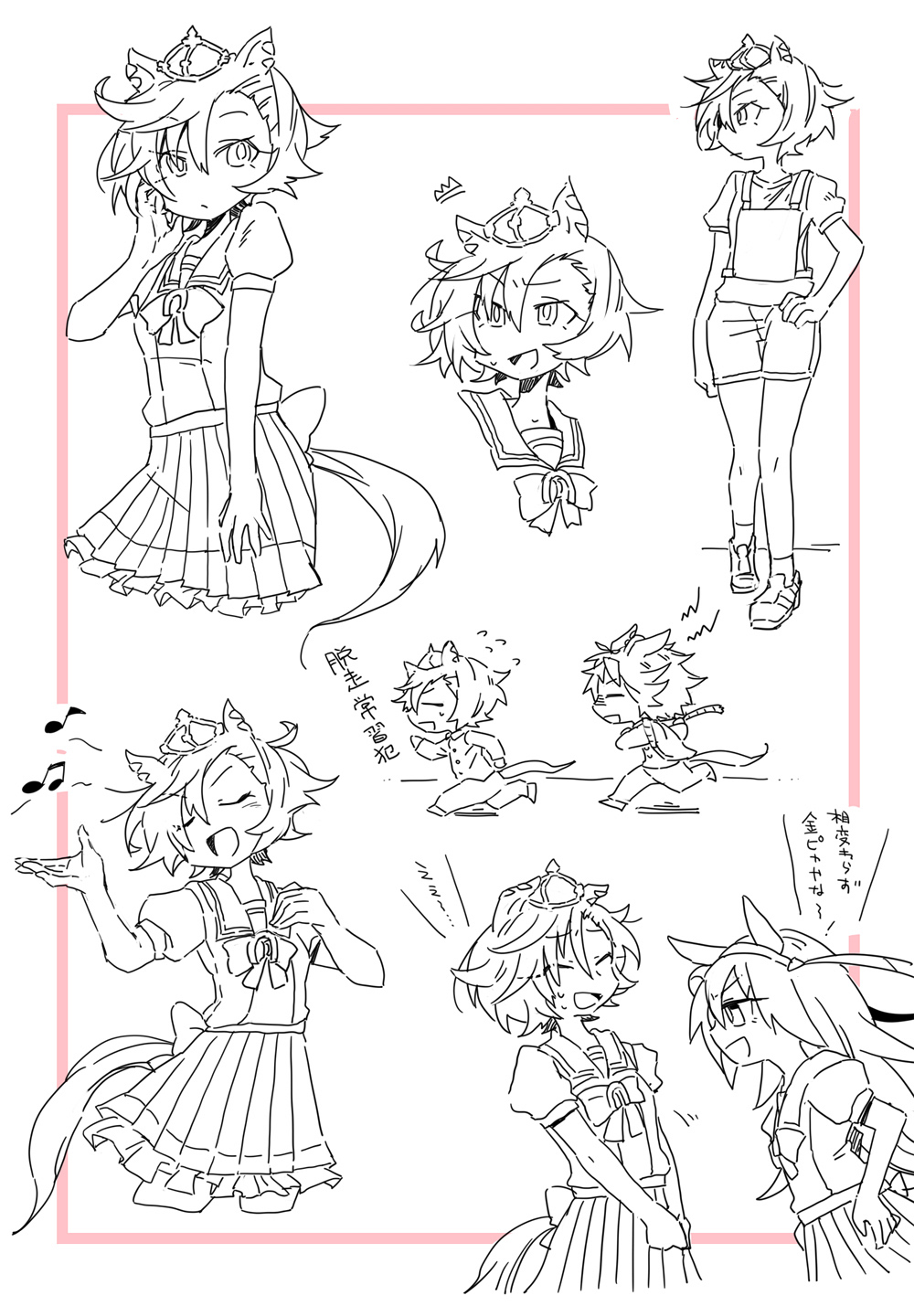 3girls :d ^^^ beamed_eighth_notes beer_hsk chibi closed_eyes closed_mouth cropped_legs crown eighth_note flying_sweatdrops frilled_skirt frills fuji_kiseki_(umamusume) greyscale hair_between_eyes hand_on_own_hip highres long_hair mini_crown monochrome multiple_girls multiple_views musical_note open_mouth original_race_uniform_(umamusume) pants pleated_skirt puffy_short_sleeves puffy_sleeves running school_uniform shirt short_sleeves shorts skirt smile t.m._opera_o_(umamusume) tamamo_cross_(umamusume) tracen_school_uniform umamusume very_long_hair white_background