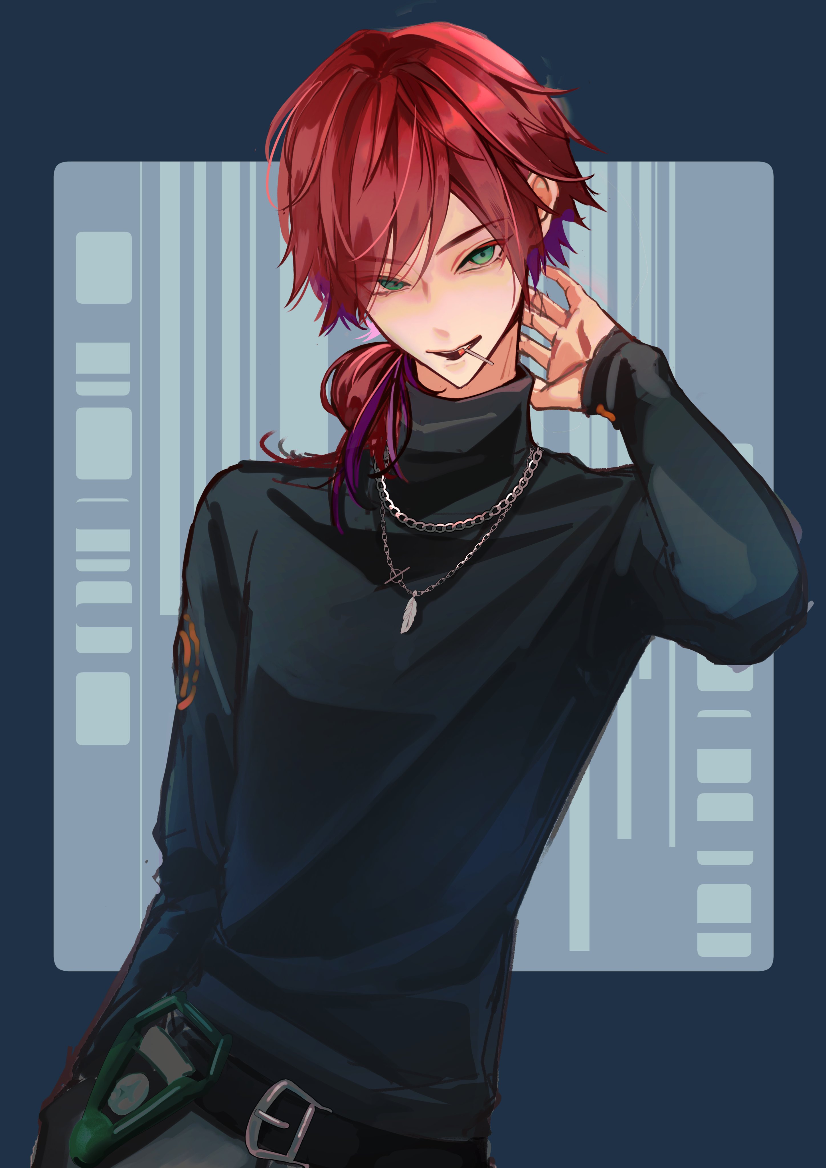 1boy absurdres alternate_costume belt black_belt black_shirt candy chain chain_necklace cowboy_shot feather_necklace food food_in_mouth green_eyes hair_between_eyes highres jewelry lauren_iroas lollipop lollipop_in_mouth long_hair long_sleeves looking_at_viewer male_focus necklace nijisanji npryygj pendant ponytail pov pov_hands red_hair shirt side_ponytail sleeves_past_wrists solo turtleneck virtual_youtuber