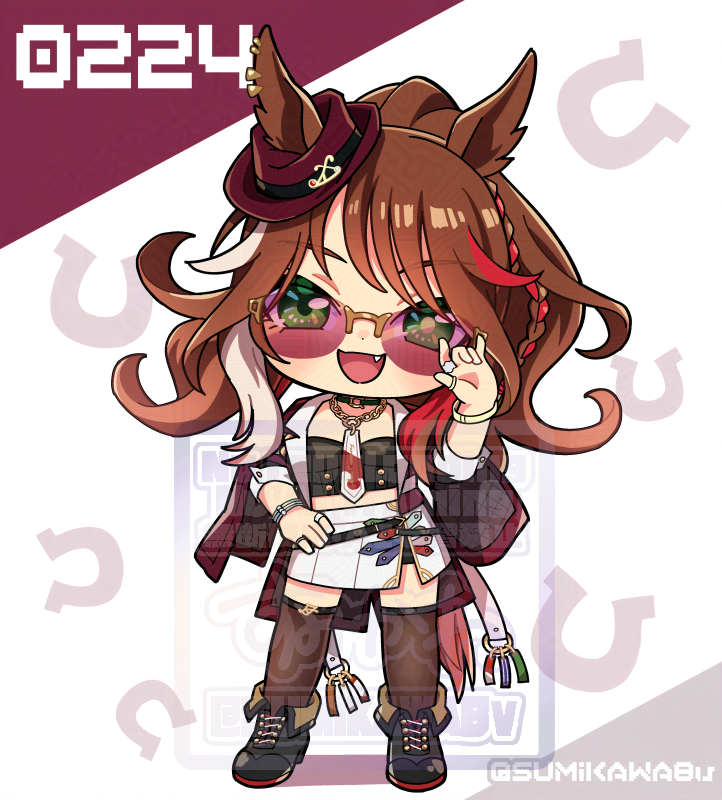 1girl ang animal_ears black_shirt black_shoes black_shorts black_thighhighs blush bracelet breasts brown_hair chibi chibi_only choker ears_through_headwear fedora forever_young_(umamusume) full_body green_choker green_eyes hand_on_own_hip hat horse_ears horse_girl jacket jewelry long_hair looking_at_viewer midriff multicolored_hair necktie open_mouth purple-tinted_eyewear red-tinted_eyewear red_jacket red_streaks shirt shoes shorts shorts_under_skirt skirt smile solo streaked_hair sumikawa_(sumikawa8v) sunglasses thighhighs tinted_eyewear umamusume white_necktie white_skirt