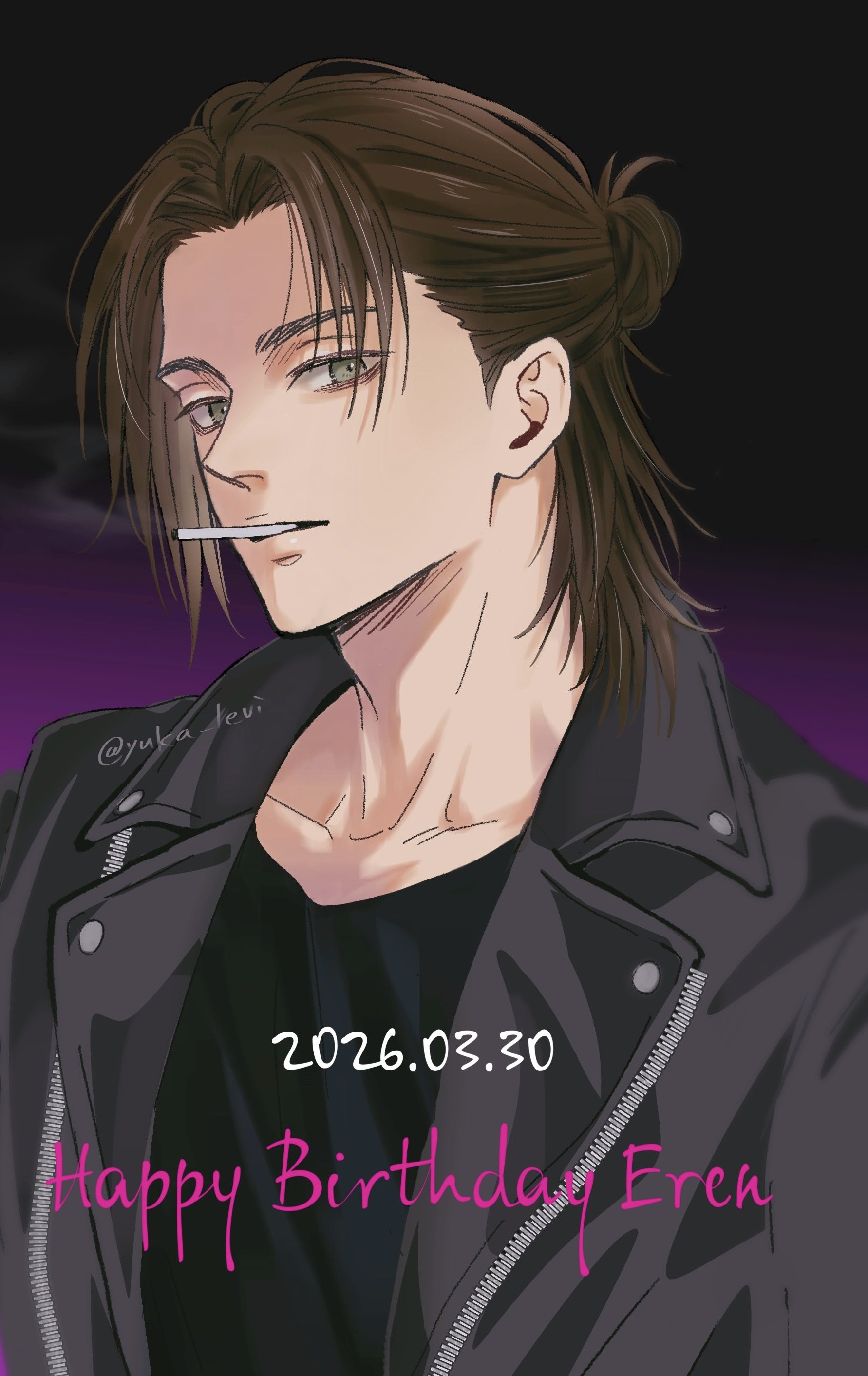 1boy 2026 absurdres black_background black_jacket black_shirt brown_hair character_name cigarette dated eren_yeager gradient_background green_eyes hair_bun half_updo happy_birthday highres jacket leather leather_jacket looking_at_viewer male_focus medium_hair parted_bangs purple_background shingeki_no_kyojin shirt smoke smoking solo twitter_username upper_body yuka_levi