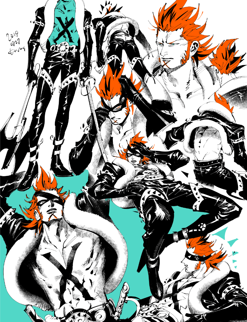 1boy abs axe belt blue_background blue_eyes commentary_request cropped_jacket cross_tattoo dated eye_mask gloves holding holding_axe holding_sword holding_weapon kotteri leather leather_pants male_focus mask multiple_views one_piece orange_hair pants sideburns signature spot_color sword tattoo weapon x_drake
