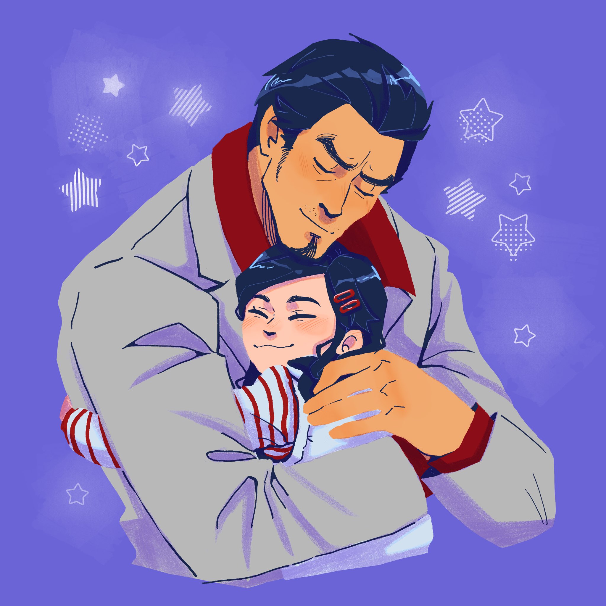 1boy 1girl ^_^ affectionate blue_hair blush closed_eyes commentary english_commentary facial_hair father_and_child father_and_daughter formal_clothes goatee highres hug jacket kiryu_kazuma mustache parent_and_child plantsforbrains purple_background red_shirt ryuu_ga_gotoku_(series) sawamura_haruka shirt short_hair star_(symbol) suit swept_bangs