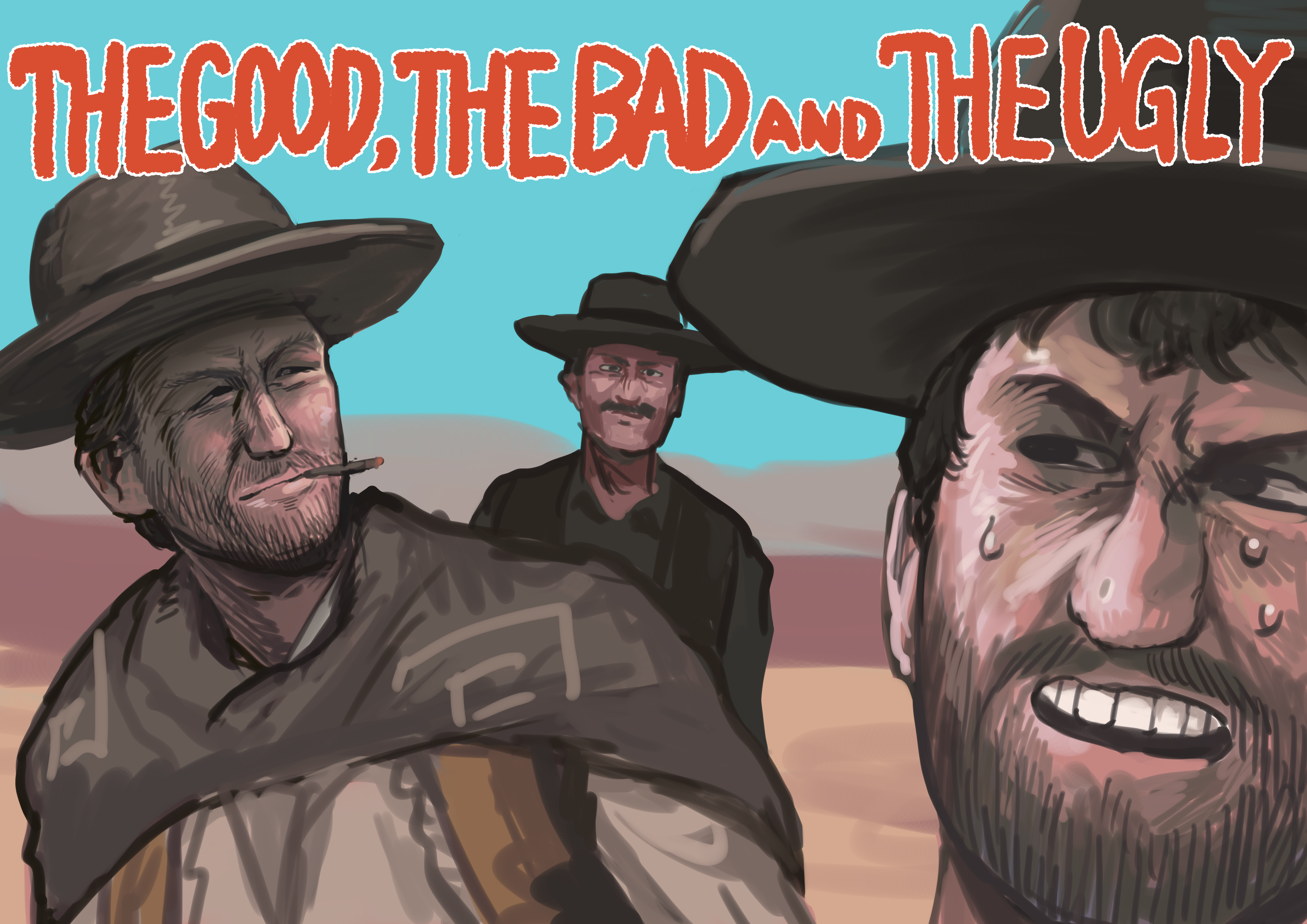 3boys absurdres beard brown_cloak brown_hat chanta_(ayatakaoisii) cigarillo cloak cowboy_hat cowboy_western day english_text facial_hair hat highres male_focus man_with_no_name multiple_boys mustache outdoors realistic_teeth squinting sweat teeth the_good_the_bad_and_the_ugly