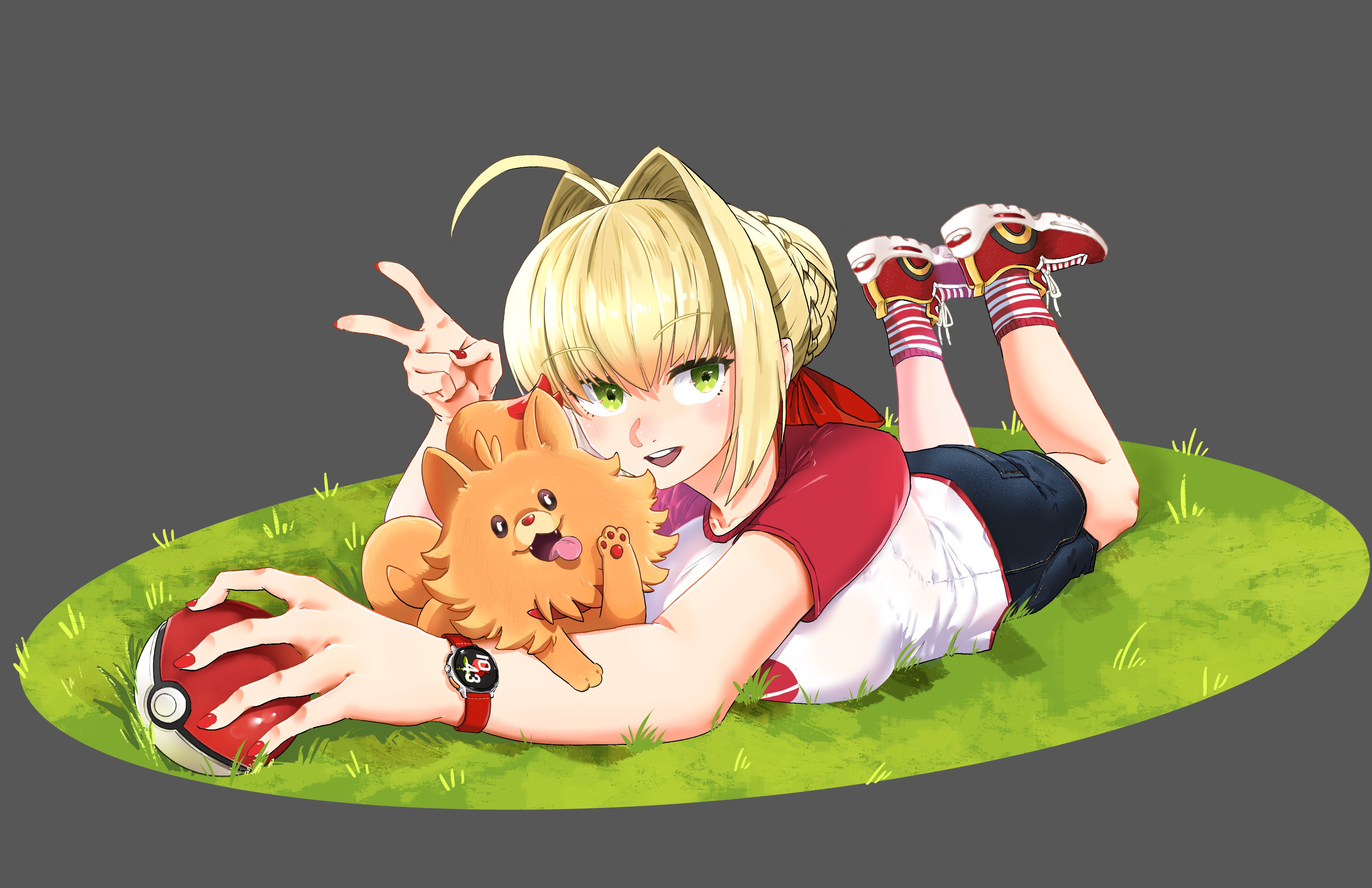 absurdres ahoge blonde_hair denim denim_shorts fate_(series) grass green_eyes highres lacerdatheweeb nero_claudius_(fate) nero_claudius_(fate/extra) nintendo poke_ball pokemon pombon red_nails red_ribbon ribbon shirt shoes shorts smartwatch smile sneakers socks striped_clothes striped_socks v watch wristwatch