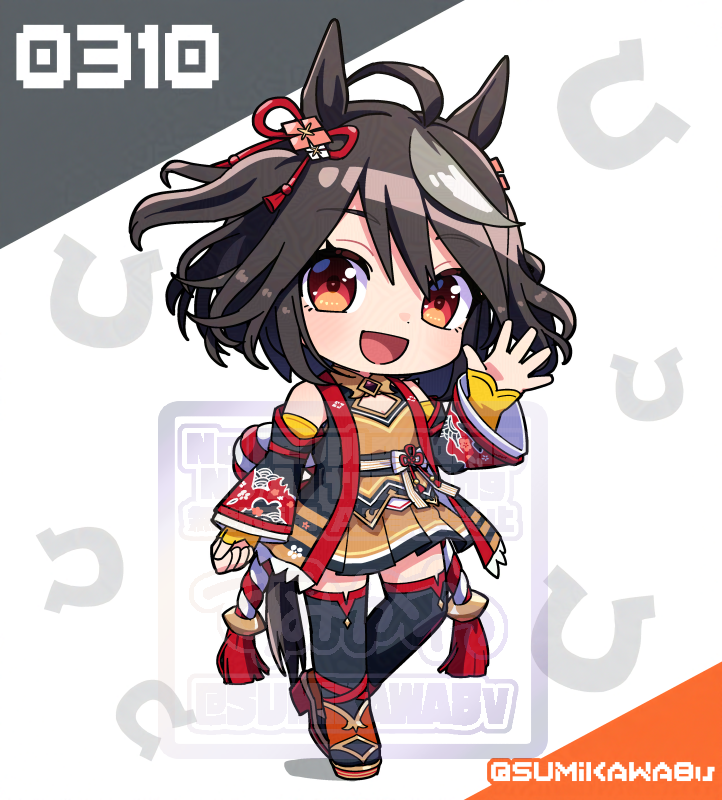 1girl ahoge animal_ears black_gem black_hair black_thighhighs blush breasts chanchanko_(clothes) chibi chibi_only cleavage_cutout clothing_cutout detached_sleeves full_body gem hair_between_eyes horse_ears horse_girl horse_tail kitasan_black_(gilded_shrine_to_glory)_(umamusume) kitasan_black_(umamusume) kouhaku_nawa looking_at_viewer multicolored_hair open_mouth red_eyes rope sandals shimenawa short_hair smile solo streaked_hair sumikawa_(sumikawa8v) tail thighhighs umamusume waving white_hair