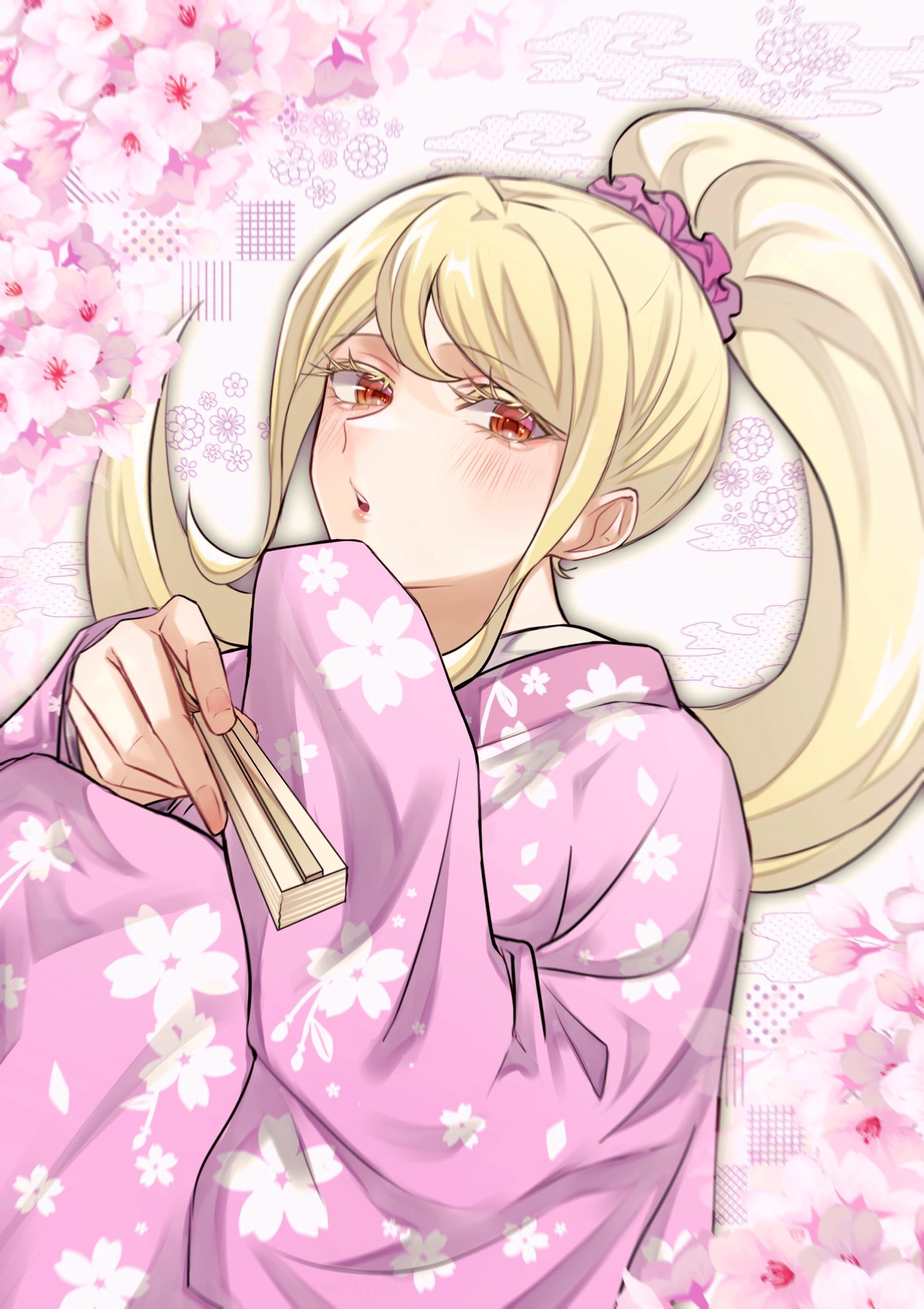 1girl :o blonde_hair blush bow danganronpa_(series) danganronpa_3_(anime) floral_print flower hair_ornament hair_scrunchie highres holding japanese_clothes kimono long_hair long_sleeves mai_duo pink_scrunchie ponytail red_eyes saionji_hiyoko scrunchie simple_background smile upper_body white_background wide_sleeves