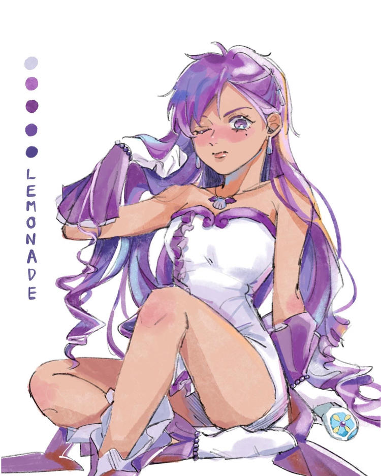 1girl anklet artist_name back_bow bare_legs bare_shoulders bead_anklet bead_bracelet beads blush boots bow bracelet caren_(mermaid_melody_pichi_pichi_pitch) collarbone color_guide commentary_request dress frilled_boots frilled_gloves frills frown full_body gloves hand_in_own_hair idol jewelry knee_up knees lipstick long_hair magical_girl makeup mermaid_melody_pichi_pichi_pitch mole mole_under_eye multicolored_gloves necklace one_eye_closed parted_lips pendant_earrings pink_lips purple_bow purple_eyes purple_gloves purple_hair realemonade shell shell_necklace short_dress simple_background solo strapless strapless_dress tan two-tone_gloves unamused very_long_hair wavy_hair white_background white_boots white_dress white_gloves