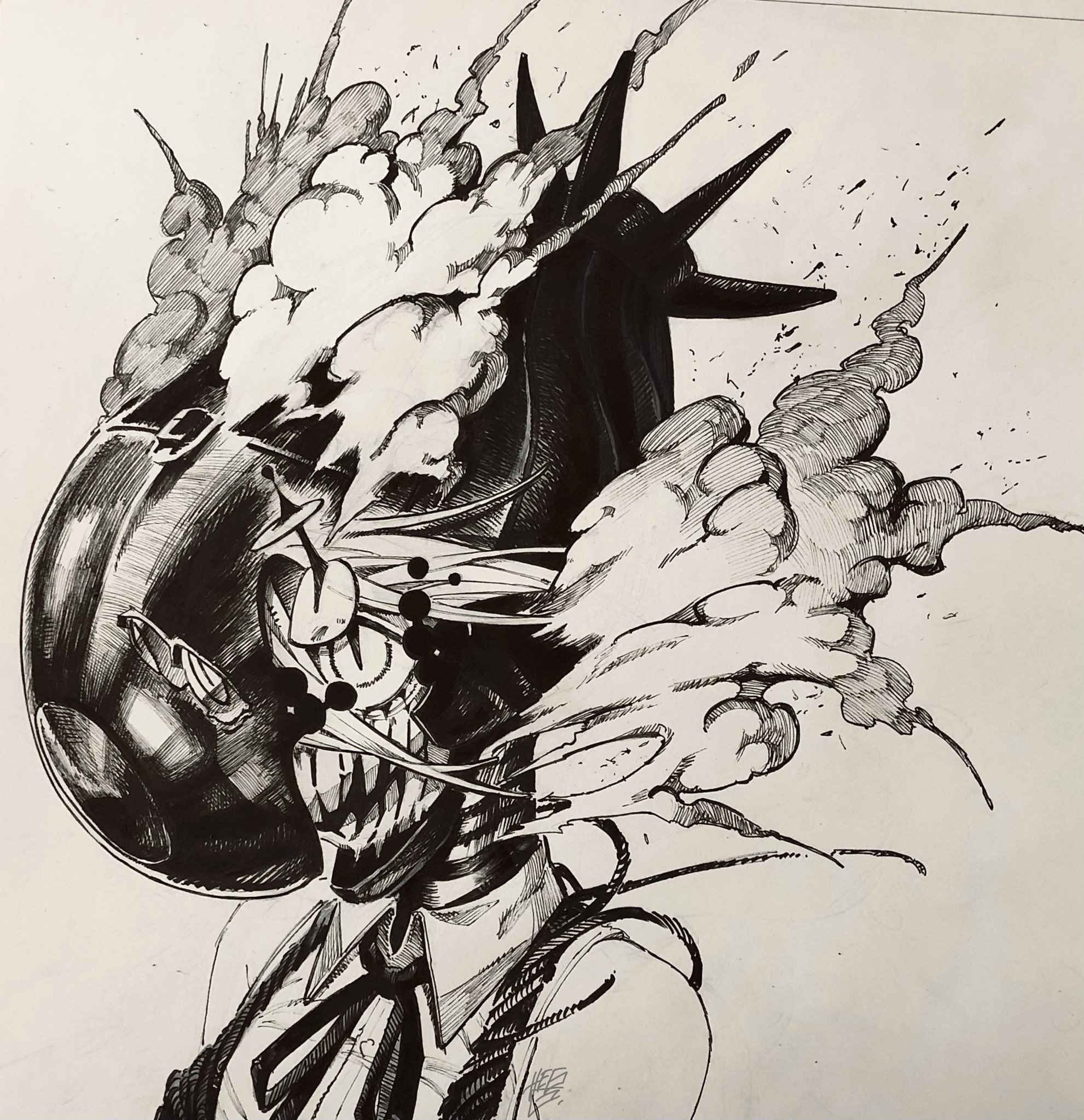 1girl black_choker bomb_devil_(chainsaw_man) chainsaw_man choker close-up explosive heggdaquyt highres object_head reze_(chainsaw_man) shirt sleeveless sleeveless_shirt solo teeth traditional_media white_shirt