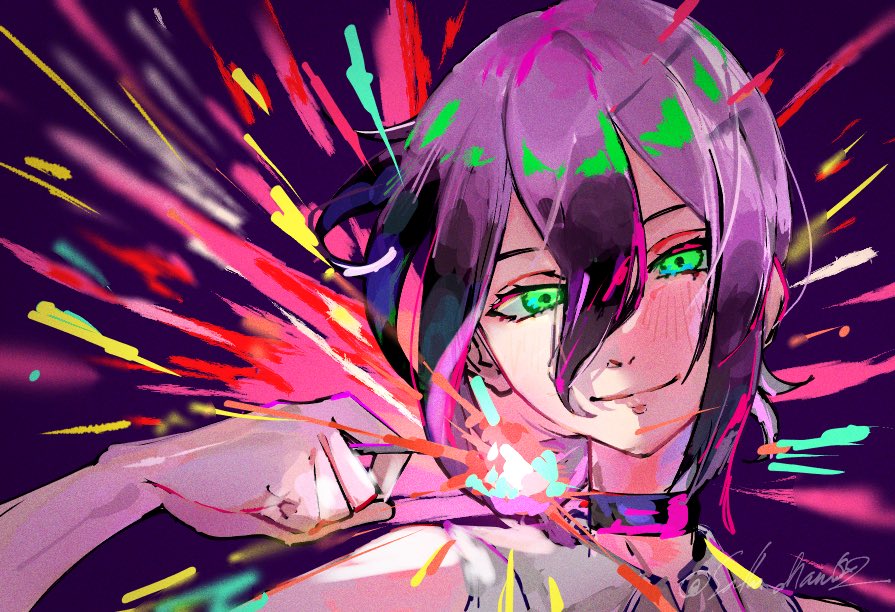 1girl black_choker blush chainsaw_man choker closed_mouth collared_shirt explosion green_eyes grenade_pin hair_between_eyes looking_at_viewer medium_hair purple_background purple_hair reze_(chainsaw_man) rnp_02 shirt sleeveless sleeveless_shirt smile solo twitter_username updo upper_body white_shirt