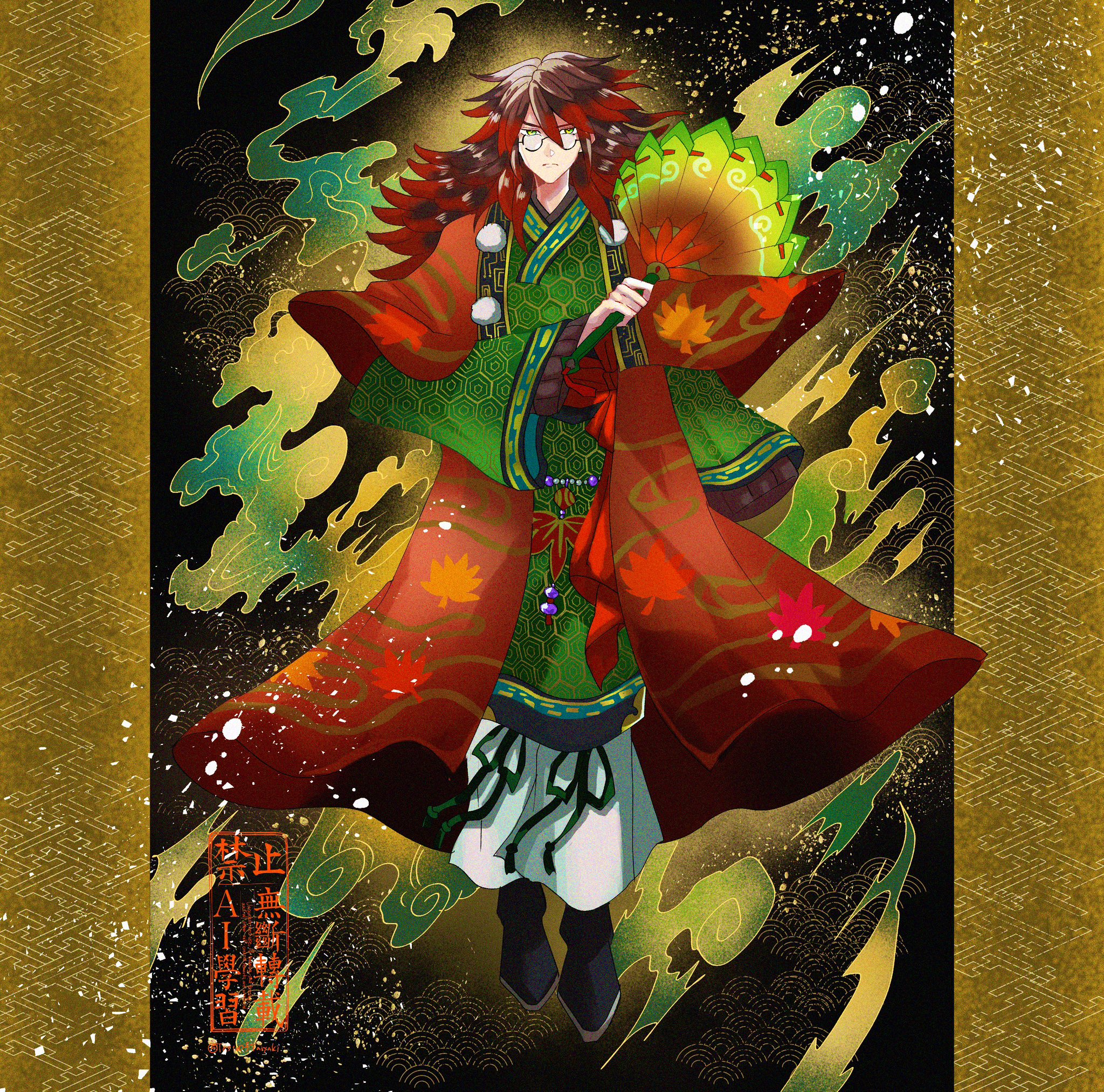 1boy frilled_hand_fan glasses gradient_hair green_eyes hair_between_eyes highres japanese_clothes kimono kurama_(rune_factory) long_hair looking_at_viewer male_focus multicolored_hair red_hair rune_factory rune_factory:_guardians_of_azuma tasteoftaiyaki wide_sleeves