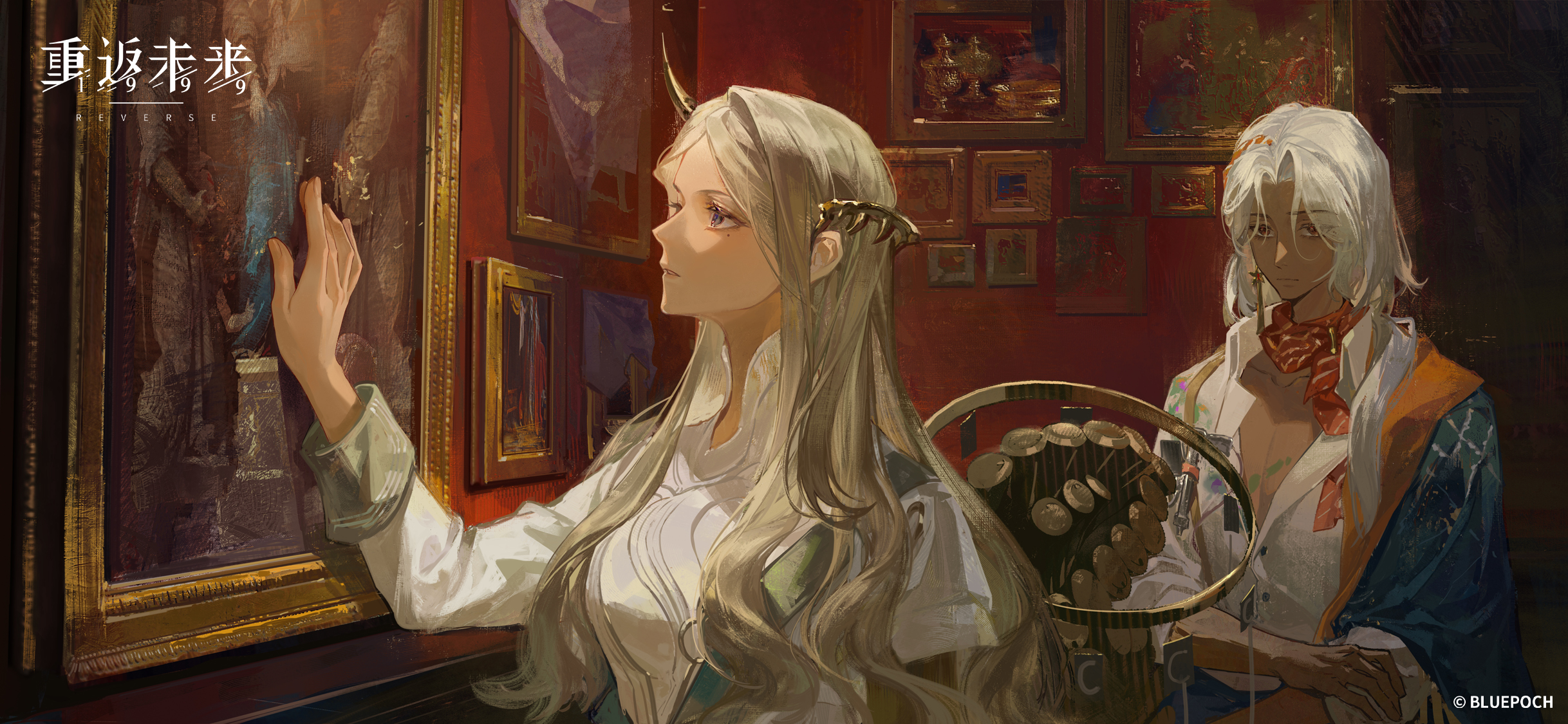 1girl anil_(reverse:1999) blue_capelet brown_eyes capelet closed_mouth copyright_name copyright_notice dark-skinned_male dark_skin earrings from_side grey_eyes grey_hair hair_ornament hand_on_own_arm hand_up highres indoors jewelry logo long_hair looking_at_another looking_at_painting lorentz_butterfly mole mole_under_eye neckerchief official_art official_wallpaper paint_on_clothes painting_(object) parted_lips profile red_neckerchief reverse:1999 shirt single_earring upper_body white_hair white_shirt