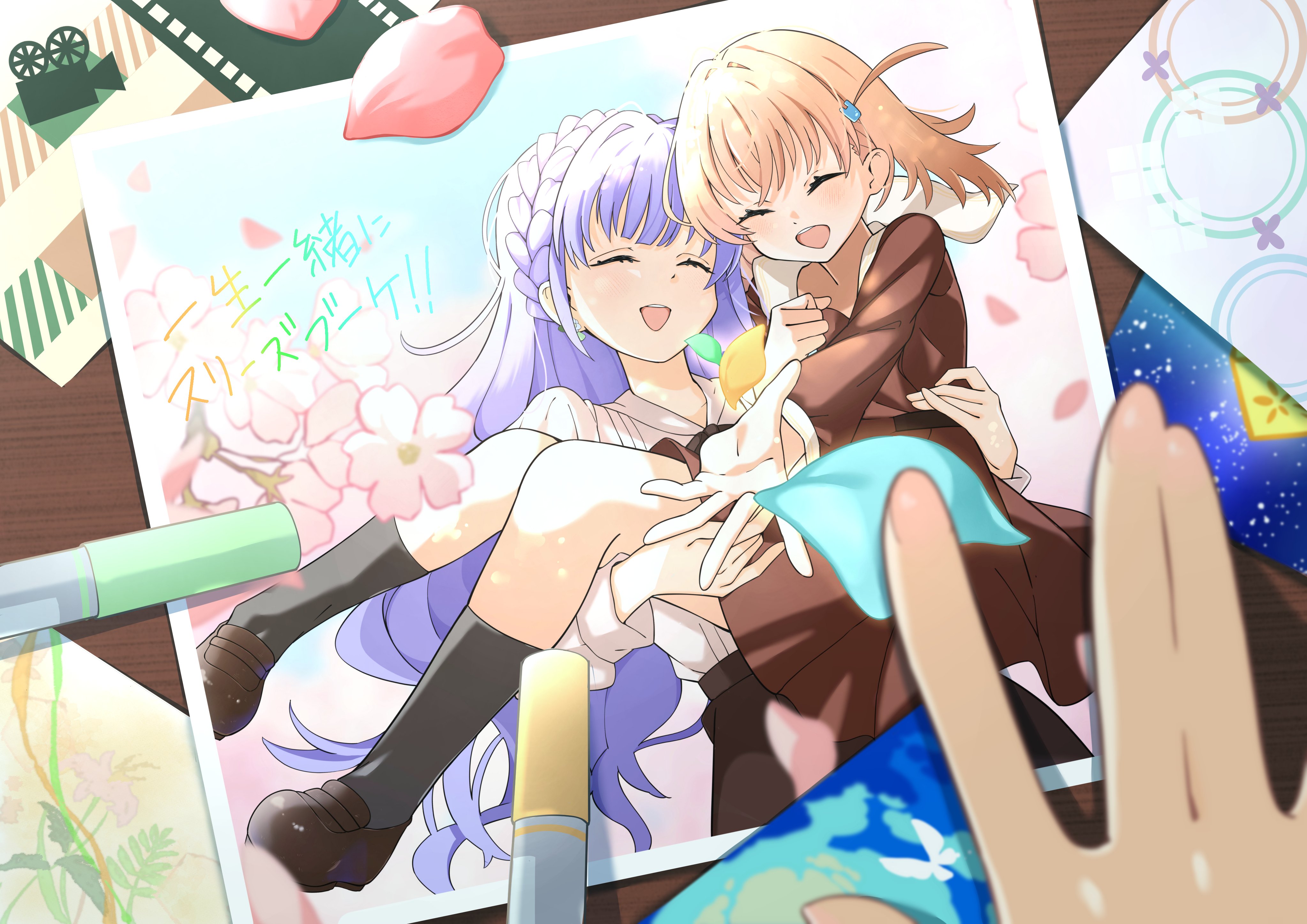 2girls :d ^_^ absurdres black_skirt black_socks braid brown_dress brown_shoes carrying cerise_bouquet closed_eyes commentary_request crown_braid dress eimii_(emmyekaki) female_pov green_petals hair_ornament hasu_no_sora_school_uniform highres hinoshita_kaho link!_like!_love_live! loafers long_hair long_sleeves love_live! marker medium_hair multiple_girls open_mouth orange_hair otomune_kozue otomune_kozue_(post-graduation) petals photo_(object) pink_petals pleated_dress pov pov_hands princess_carry purple_hair rabbit_hair_ornament sailor_collar sailor_dress school_uniform shirt shoes skirt smile socks teeth two_side_up upper_teeth_only very_long_hair virtual_youtuber white_sailor_collar white_shirt winter_uniform yellow_petals yuri