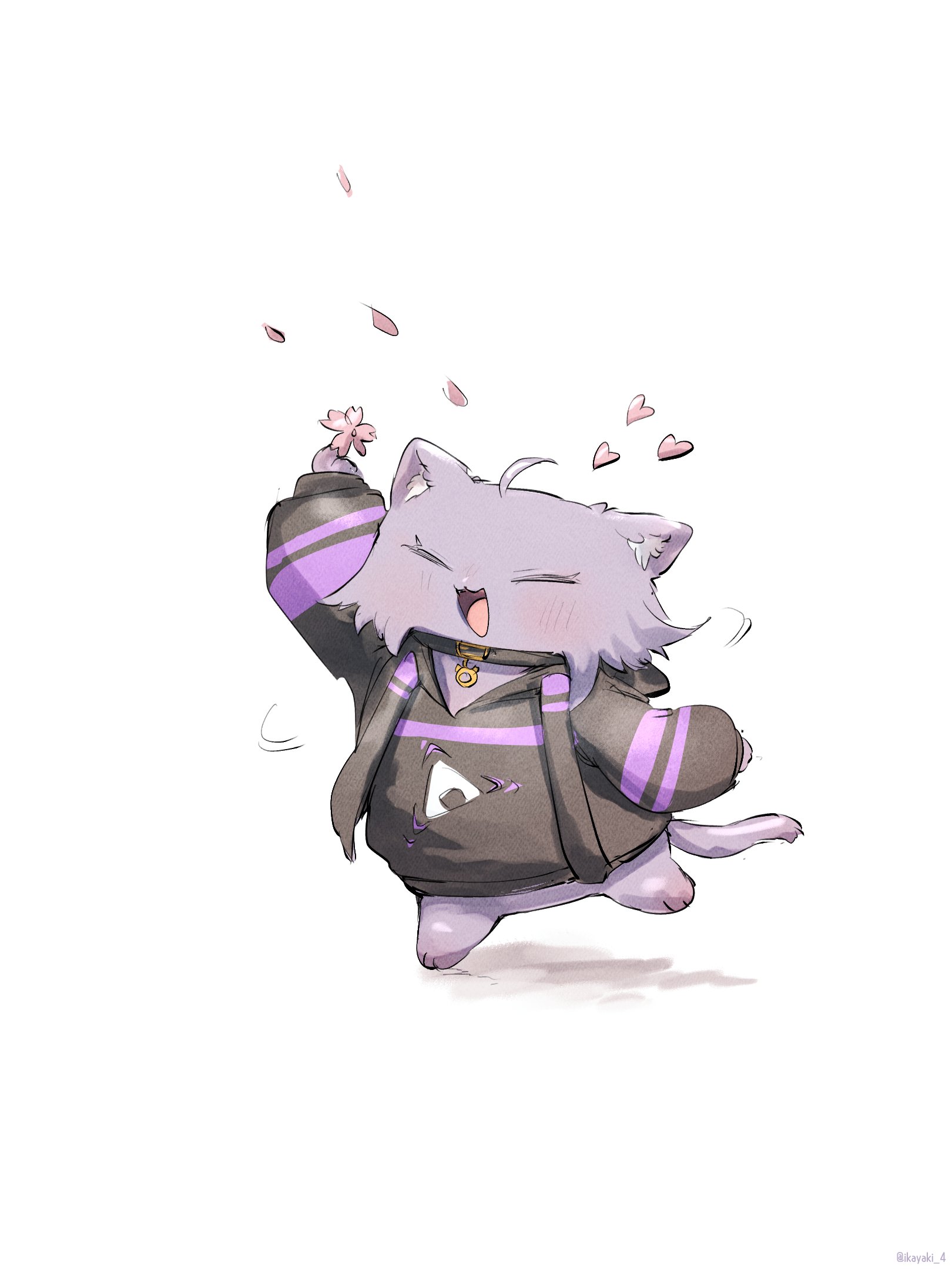 animal animal_collar animal_focus animalization black_collar black_hoodie blush cat closed_eyes clothed_animal collar drawstring food_print full_body happy heart highres hololive hood hoodie ikayaki_(ikayaki4) long_sleeves nekomata_okayu no_humans onigiri_print open_mouth print_hoodie simple_background solo virtual_youtuber white_background