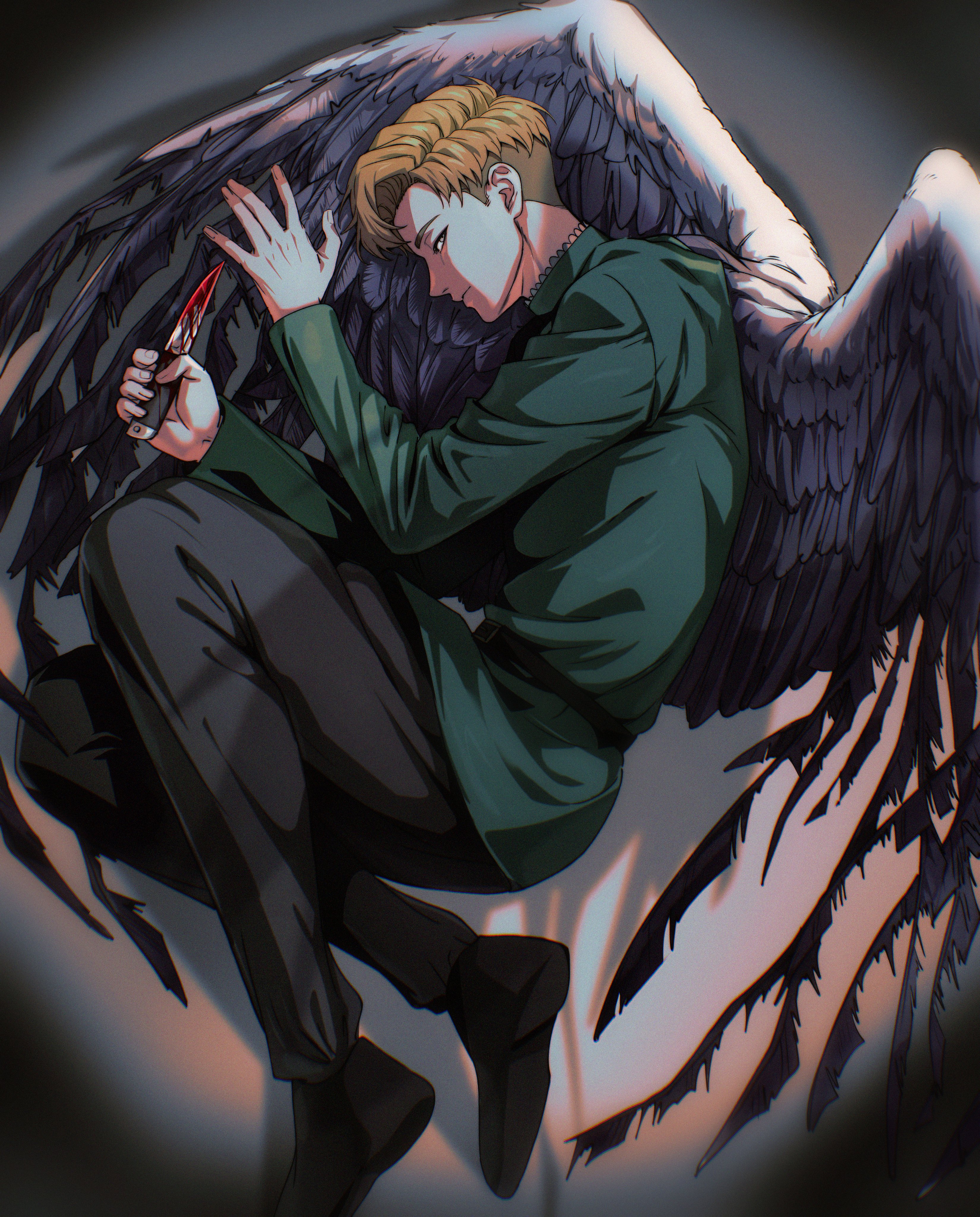 1boy absurdres belt black_belt black_pants black_shoes blonde_hair blood blood_on_face chi.:_chikyuu_no_undou_ni_tsuite closed_mouth commentary_request feathered_wings fetal_position from_side full_body green_jacket grntr_260106 highres holding holding_knife jacket knife looking_at_viewer male_focus pants rafal_(chi.) shoe_soles shoes short_hair sideburns sideways_glance solo wings