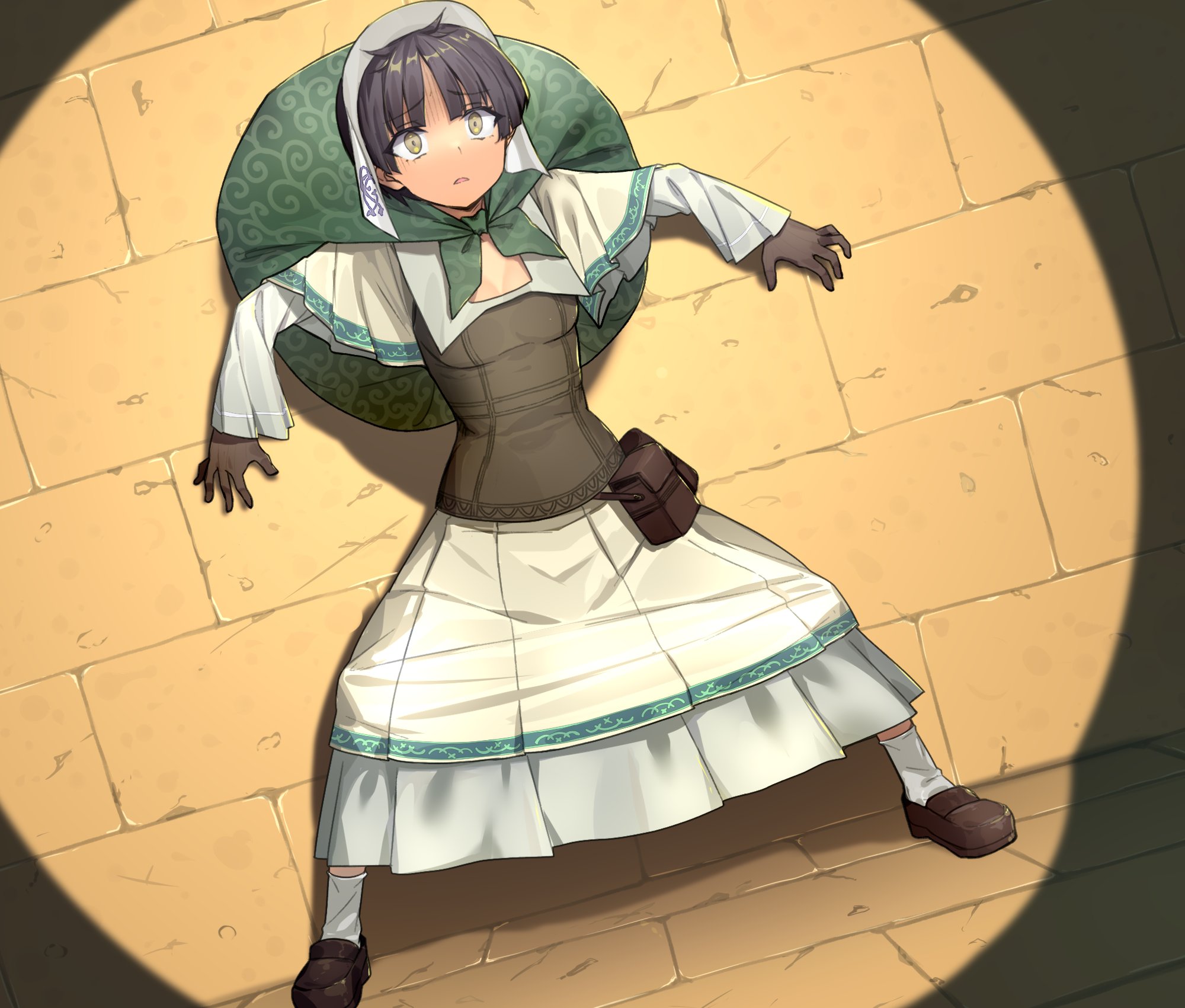 1girl against_wall apo_(apos2721) bag belt_pouch black_gloves black_hair black_shirt black_shoes brown_eyes burglar commentary dutch_angle full_body furoshiki gloves green_bag highres karakusa_(pattern) lappet legs_apart parted_lips peruele_kalette pouch rance_(series) searchlight shirt shoes short_hair skirt socks solo standing stone_floor stone_wall theft white_skirt white_sleeves white_socks wide-eyed