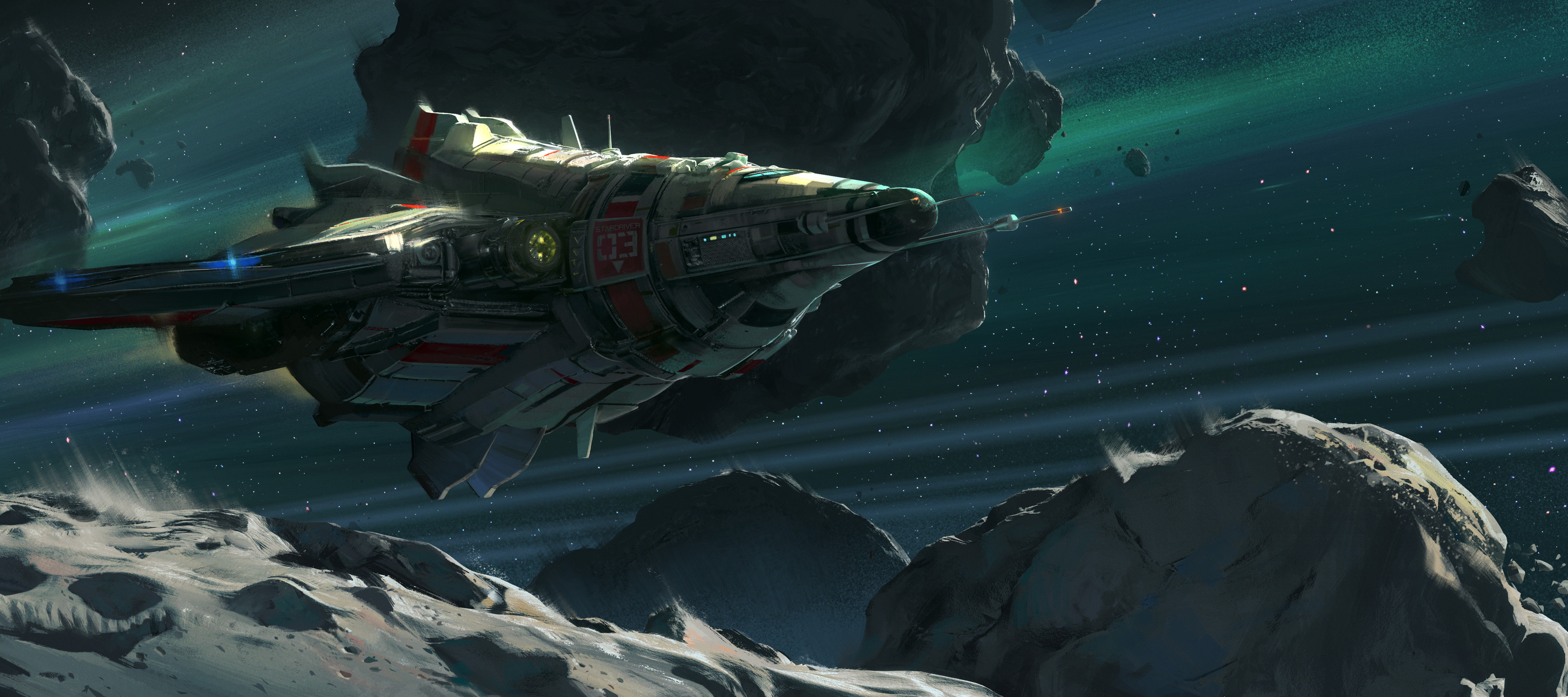 absurdres asteroid commentary crimsonsword03 english_commentary floating_rock highres landscape light_trail no_humans original outdoors painterly scenery sky space spacecraft star_(sky) starry_sky sunlight