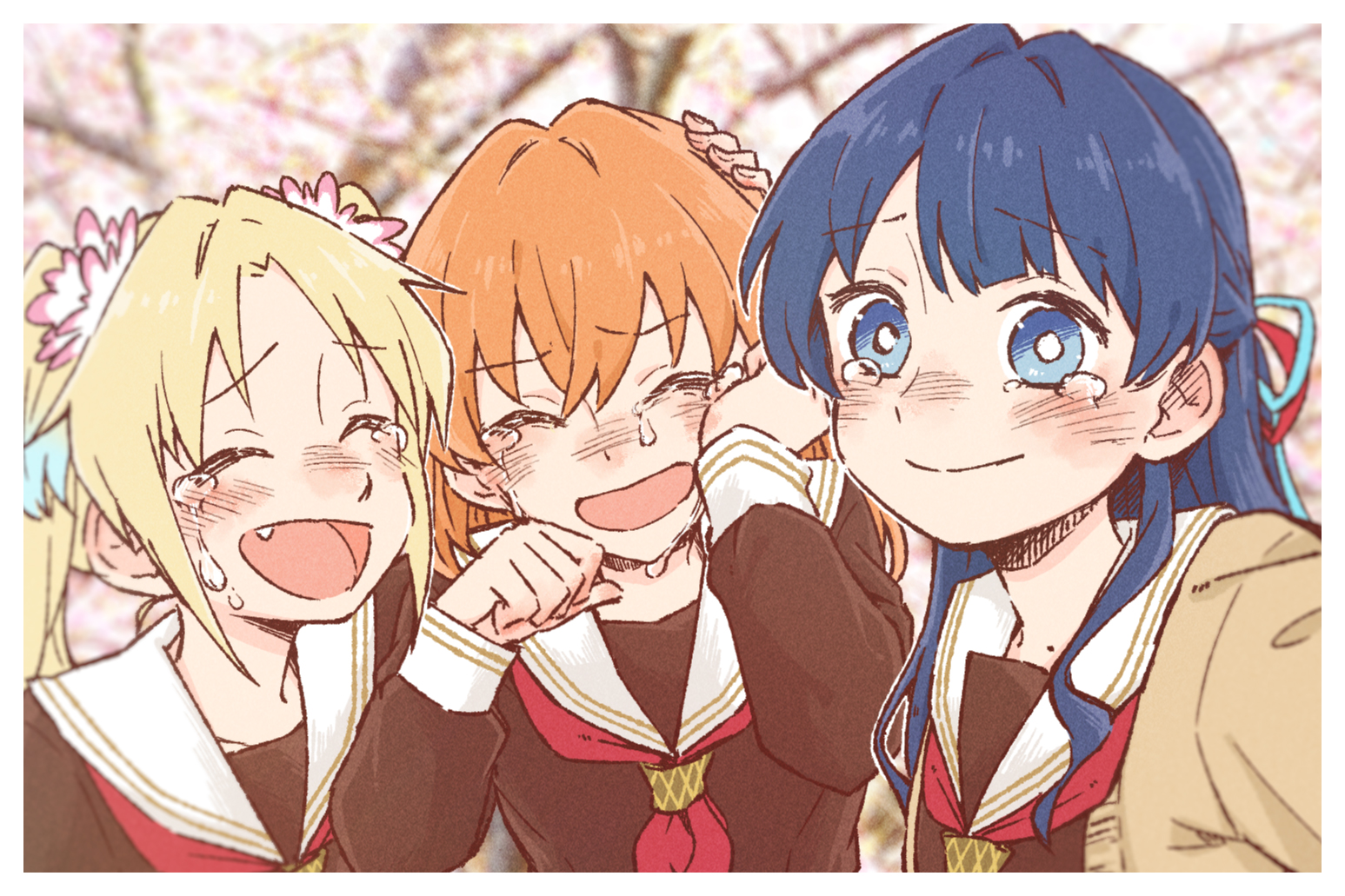 3girls :d blue_eyes blue_ribbon border bright_pupils brown_cardigan brown_dress cardigan cherry_blossoms closed_mouth commentary crying dress fang graduation hair_ribbon half_updo hasu_no_sanrenka hasu_no_sora_school_uniform hinoshita_kaho link!_like!_love_live! long_sleeves looking_at_viewer love_live! mole mole_on_neck multiple_girls murano_sayaka neckerchief open_cardigan open_clothes open_mouth osawa_rurino outdoors parted_bangs raised_inner_eyebrows red_neckerchief red_ribbon ribbon sailor_collar sailor_dress sakuma_yoru school_uniform smile tearing_up tears upper_body virtual_graduation_commemoration virtual_youtuber white_border white_pupils white_sailor_collar winter_uniform wiping_tears