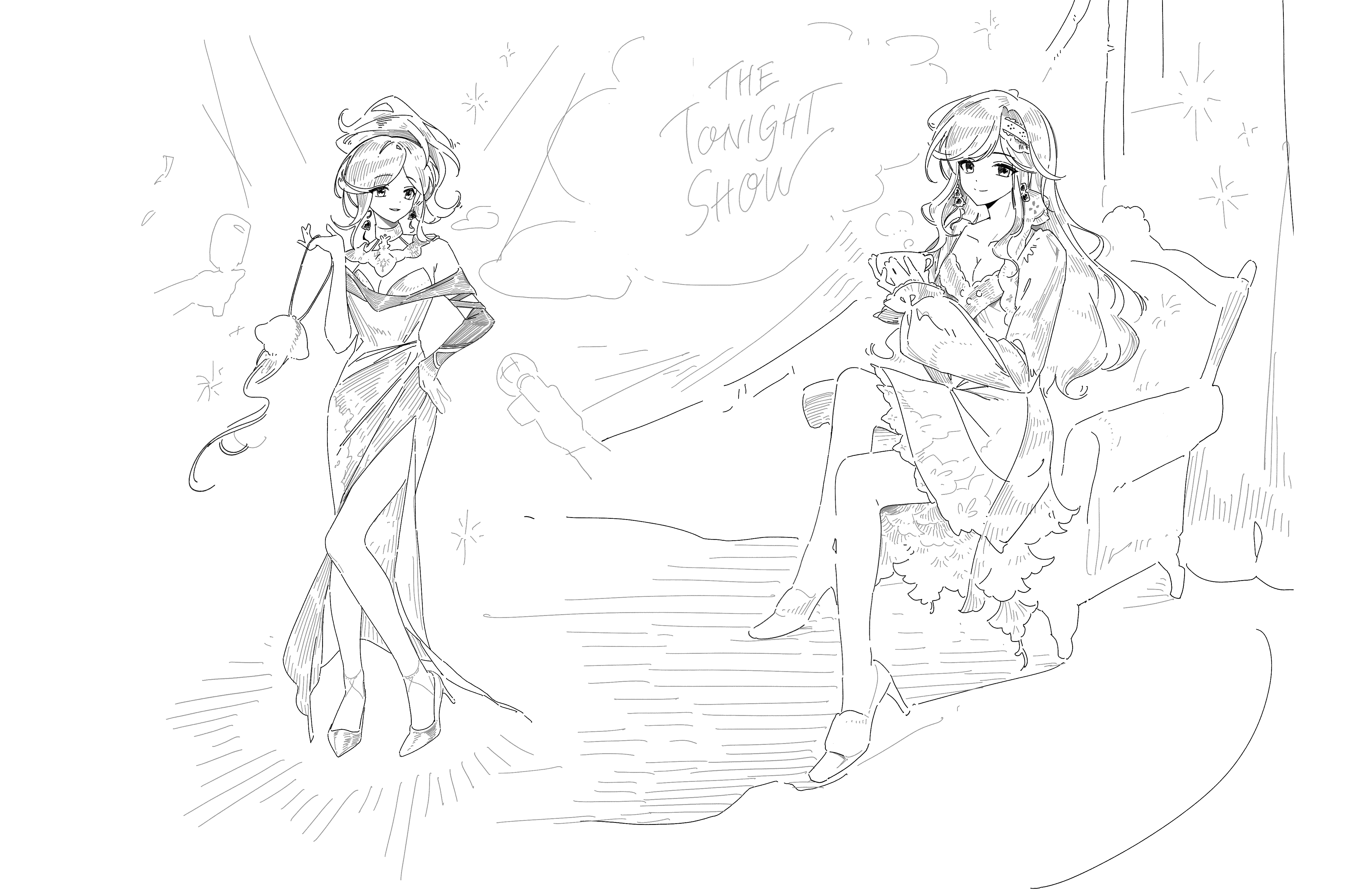 1girl absurdres bag chair closed_mouth crossed_legs cup dress eternity_(reverse:1999) evening_gown full_body greyscale grin handbag high_heels highres holding holding_bag holding_cup jellyfish_earrings jewelry knees_together_feet_apart lineart long_dress looking_at_viewer monochrome multiple_views necklace nightgown off-shoulder_dress off_shoulder on_chair ponytail reverse:1999 side_slit sitting smile standing xiaoxiaowu