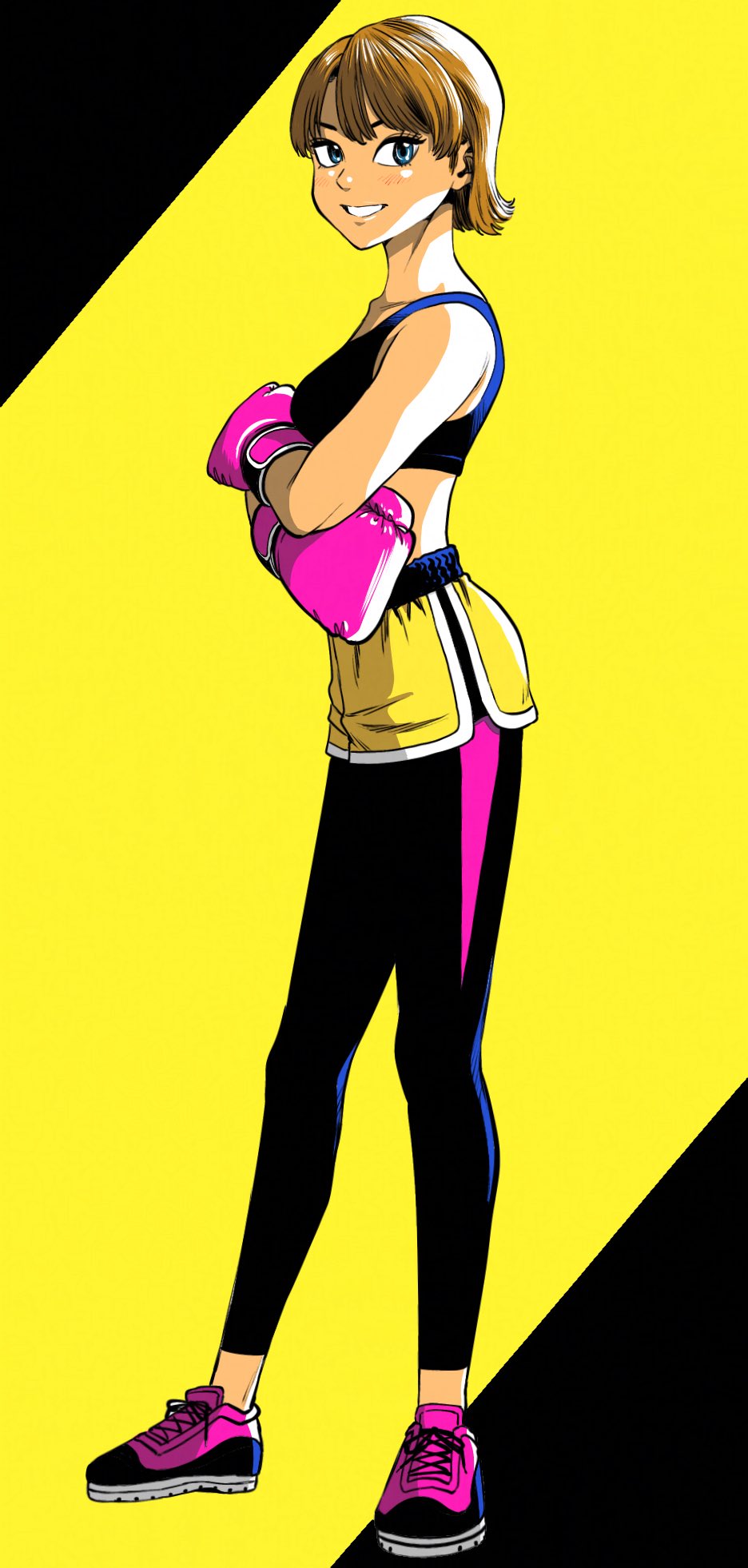 1girl black_leggings blue_eyes blue_sports_bra boxing_gloves breasts brown_hair commentary_request crossed_arms dolphin_shorts full_body gloves highres lee_(dragon_garou) leggings leggings_under_shorts medium_breasts midriff original pink_gloves pink_shoes shoes short_hair short_shorts shorts smile sneakers solo sports_bra yellow_shorts