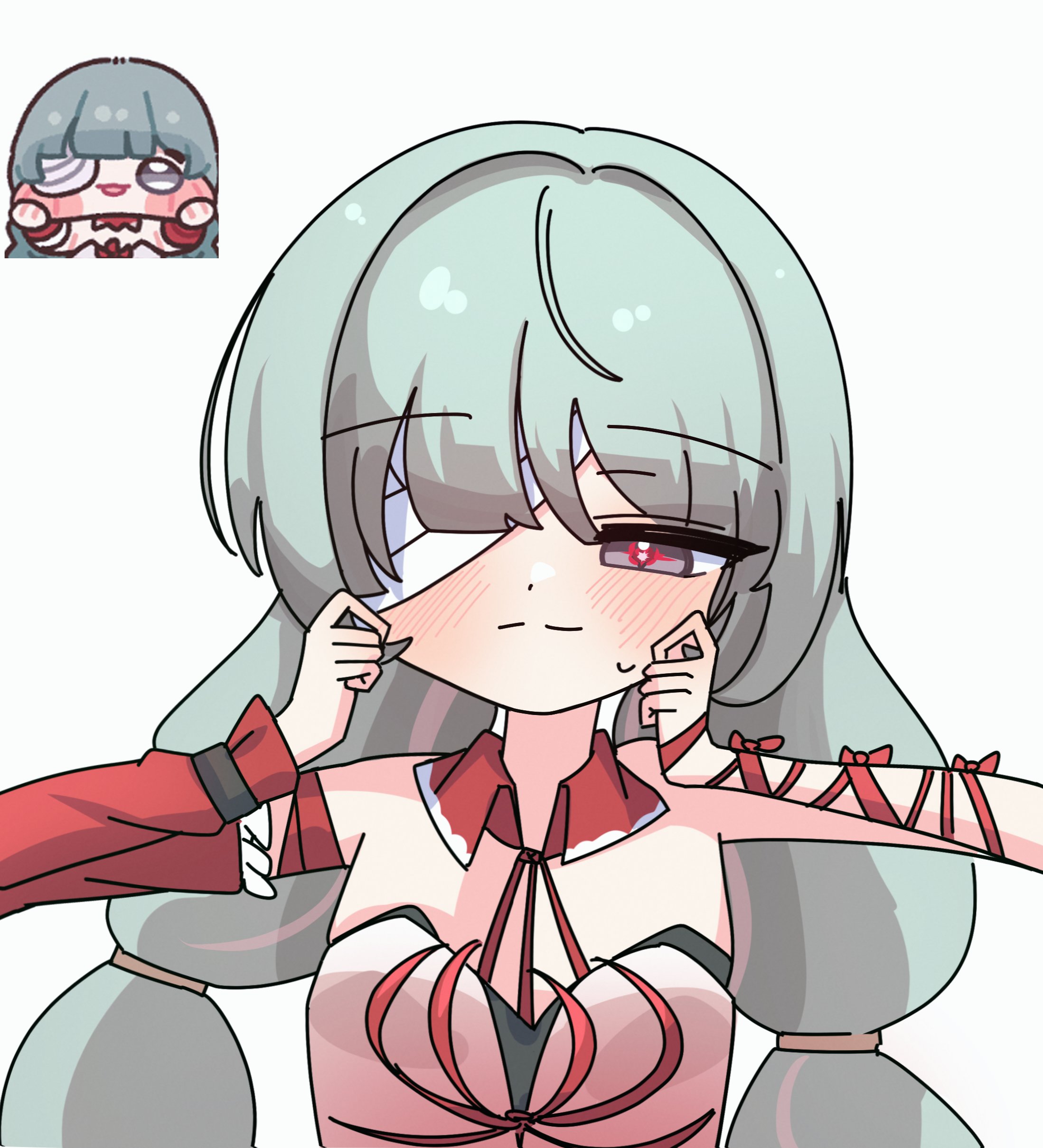 1girl absurdres bandage_over_one_eye bare_shoulders blush breasts cheek_pull commentary grey_eyes grey_hair highres kimmi_(tsora0_17) long_hair looking_at_viewer medium_breasts multicolored_hair oldstore phrolova_(wuthering_waves) red_pupils reference_inset smile solo streaked_hair untranslatable_commentary upper_body wuthering_waves