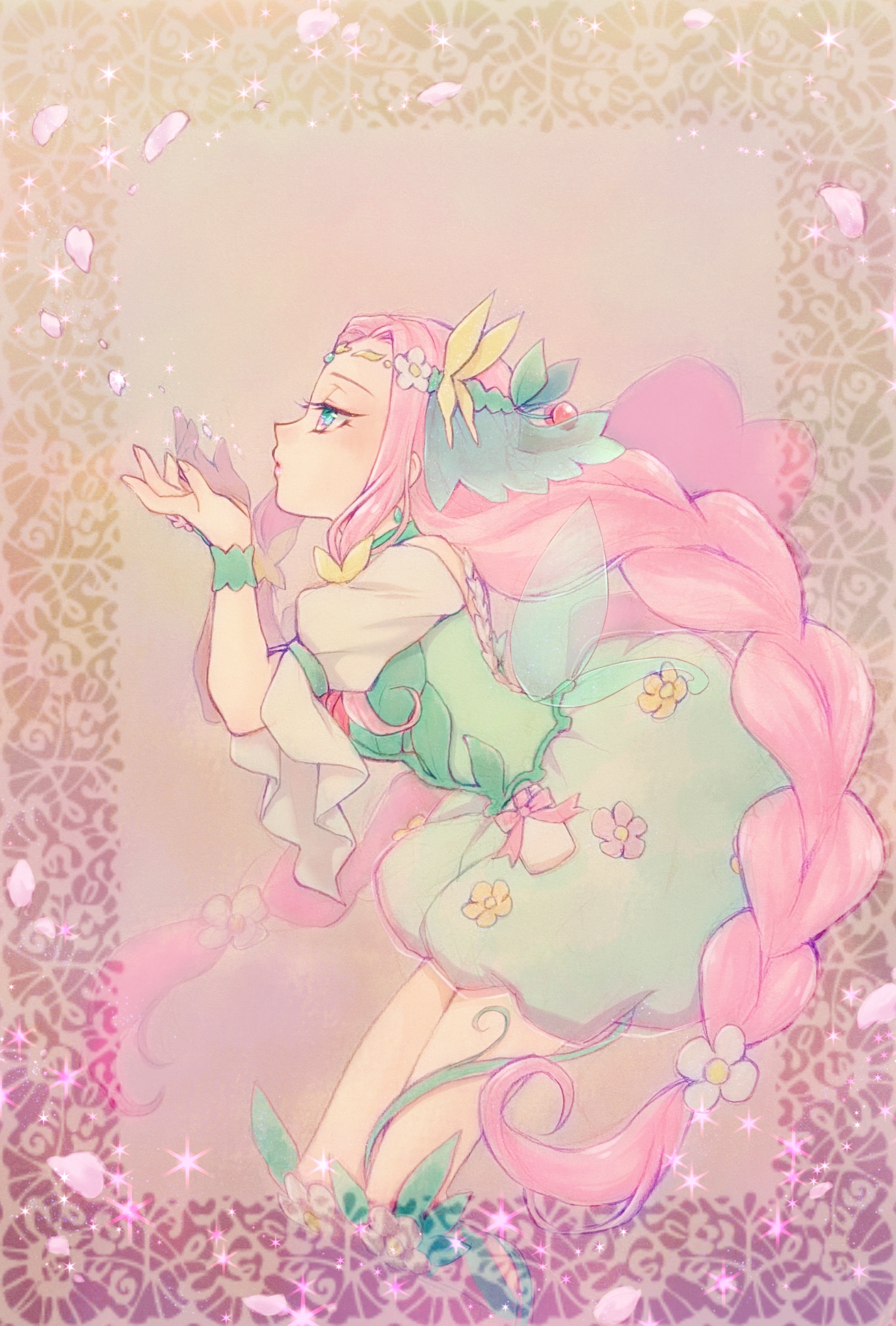 1girl aizen_(syoshiyuki) aqua_eyes bag bag_bow blowing border bow braid bubble_skirt butterfly_hair_ornament choker circlet commentary_request cure_felice dress dress_flower eyelashes fairy fairy_wings flower flower_in_eye forehead from_side full_body gradient_background green_choker green_dress green_shoes green_wings hair_flower hair_ornament hanami_kotoha highres light_blush lipstick long_hair looking_ahead low_twin_braids magical_girl mahou_girls_precure! makeup orange_flower ornate_border outside_border parted_lips petals pink_background pink_bow pink_flower pink_hair pink_lips plant pointy_nose precure shoes short_dress skirt solo symbol_in_eye transparent twin_braids very_long_hair vines waist_bag white_bag white_flower wings