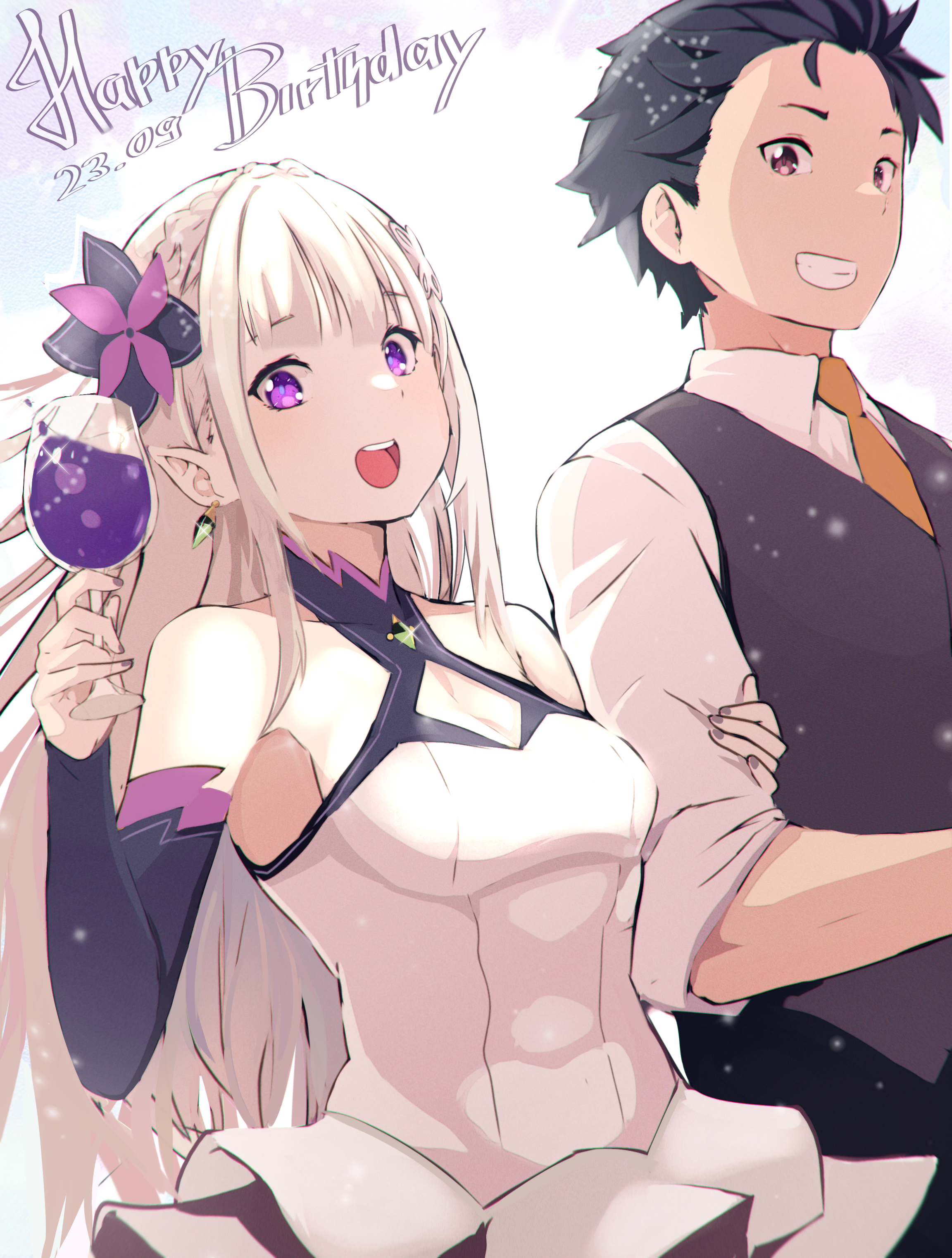 1boy 1girl absurdres alternate_costume bare_shoulders black_hair braid breasts brown_eyes cleavage cleavage_cutout clothing_cutout commentary crown_braid cup detached_sleeves dress drinking_glass earrings elf emilia_(re:zero) english_text flower gem green_gem hair_flower hair_ornament hair_slicked_back happy_birthday highres holding holding_cup jewelry locked_arms long_hair long_sleeves looking_at_viewer medium_breasts natsuki_subaru open_mouth pointy_ears purple_eyes re:zero_kara_hajimeru_isekai_seikatsu shirt short_hair simple_background smile vest white_dress white_hair white_shirt x_hair_ornament zerobarto