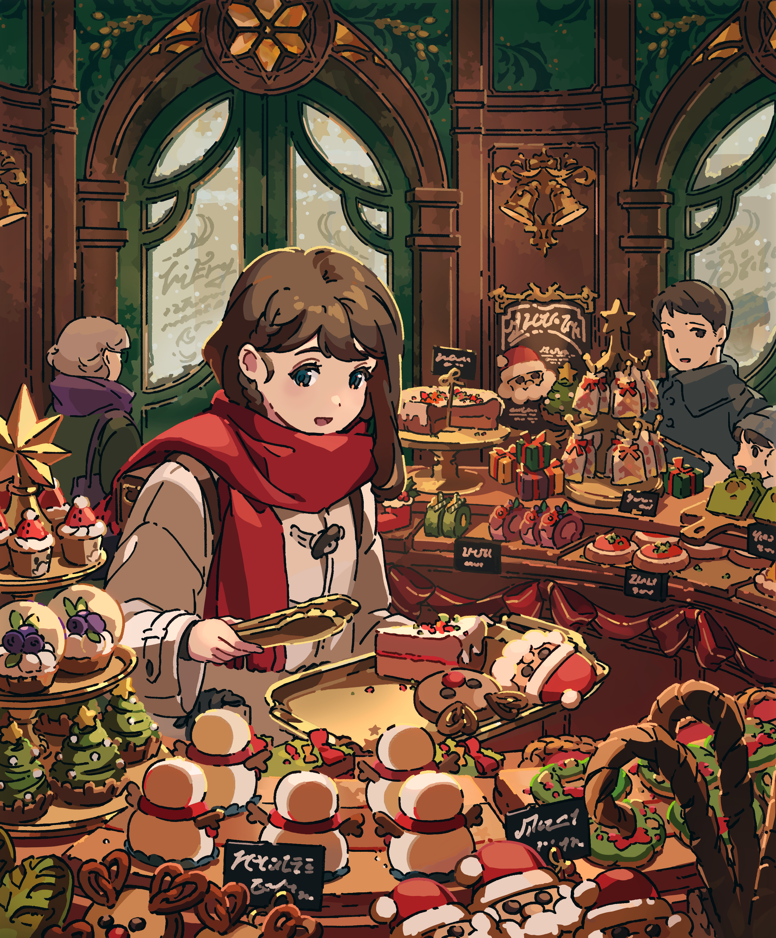 1boy 1other 2girls absurdly_detailed_composition absurdres ambiguous_gender aqua_eyes arch bell black_coat braid brown_hair cake cake_slice christmas christmas_star christmas_tree coat commentary cupcake english_commentary food gingerbread_cookie grey_hair highres holding holding_tongs holding_tray indoors loaded_interior long_hair long_sleeves mia_arai000oj multiple_girls open_mouth original purple_scarf red_scarf scarf scenery shop short_hair side_braid sign slice_of_life snowman solo_focus standing straight_hair tongs translation_request tray very_short_hair white_coat
