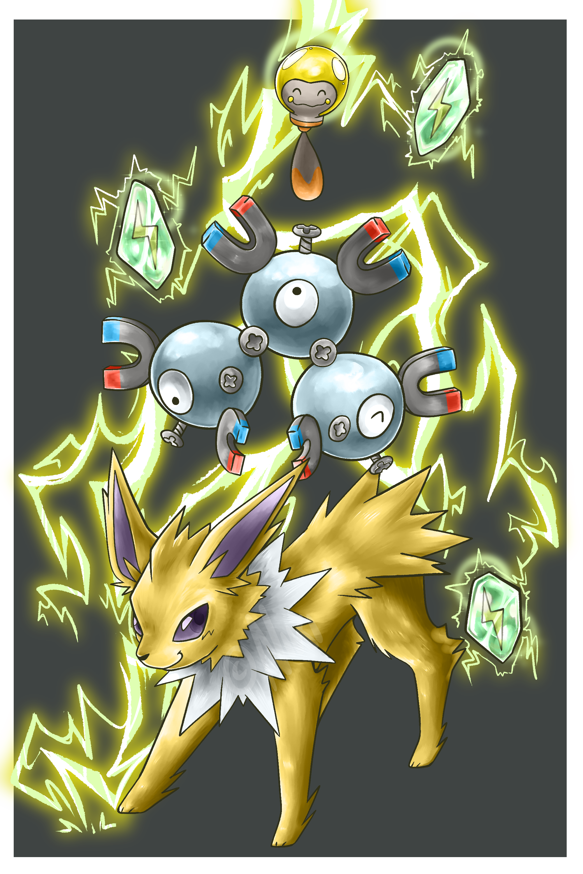 absurdres border closed_eyes closed_mouth commentary electricity english_commentary evolution_stone evolutionary_stone floating full_body gen_1_pokemon grey_background highres jolteon justmenikisan magnet magneton nintendo no_humans one-eyed pokemon pokemon_(creature) pokemon_focus screw simple_background smile tadbulb thunder_stone transparent_border wavy_mouth