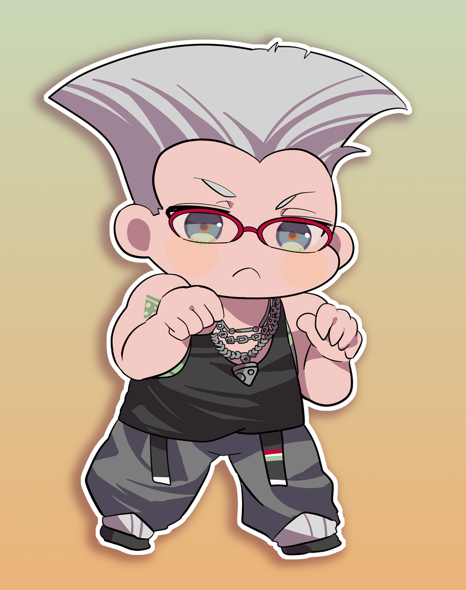 >:( 1boy alternate_hairstyle arm_tattoo arurandeisu baggy_pants black_tank_top chain chain_necklace chibi chibi_only clenched_hands commentary_request cosplay fighting_stance flattop full_body glasses gradient_background green_eyes grey_pants guile guile_(cosplay) highres holostars jewelry male_focus necklace outline pants red-framed_eyewear sleeveless solo street_fighter tank_top tattoo v-shaped_eyebrows virtual_youtuber white_outline yamada_(nou_74)