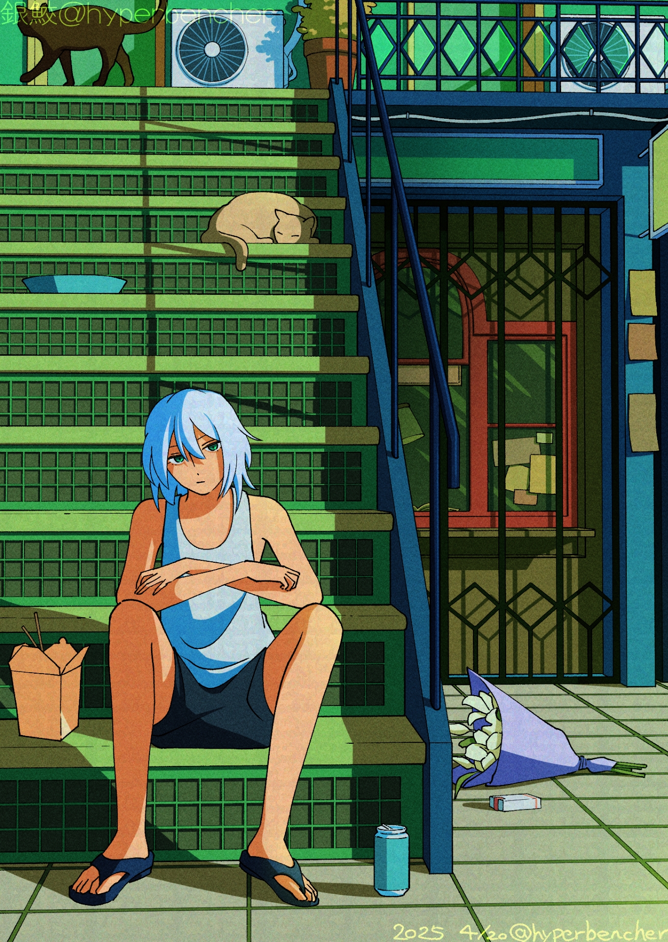 1other androgynous animal bare_arms black_cat black_shorts blue_hair blue_tank_top bouquet box brown_cat cat chopsticks closed_mouth commentary_request crossed_arms dot_nose double-parted_bangs expressionless flip-flops flower full_body green_eyes hair_between_eyes highres hyperbencher indoors long_bangs looking_at_viewer original railing sandals scenery shadow short_hair short_shorts shorts sitting sitting_on_stairs sleeping_animal stairs tank_top tile_floor tiles