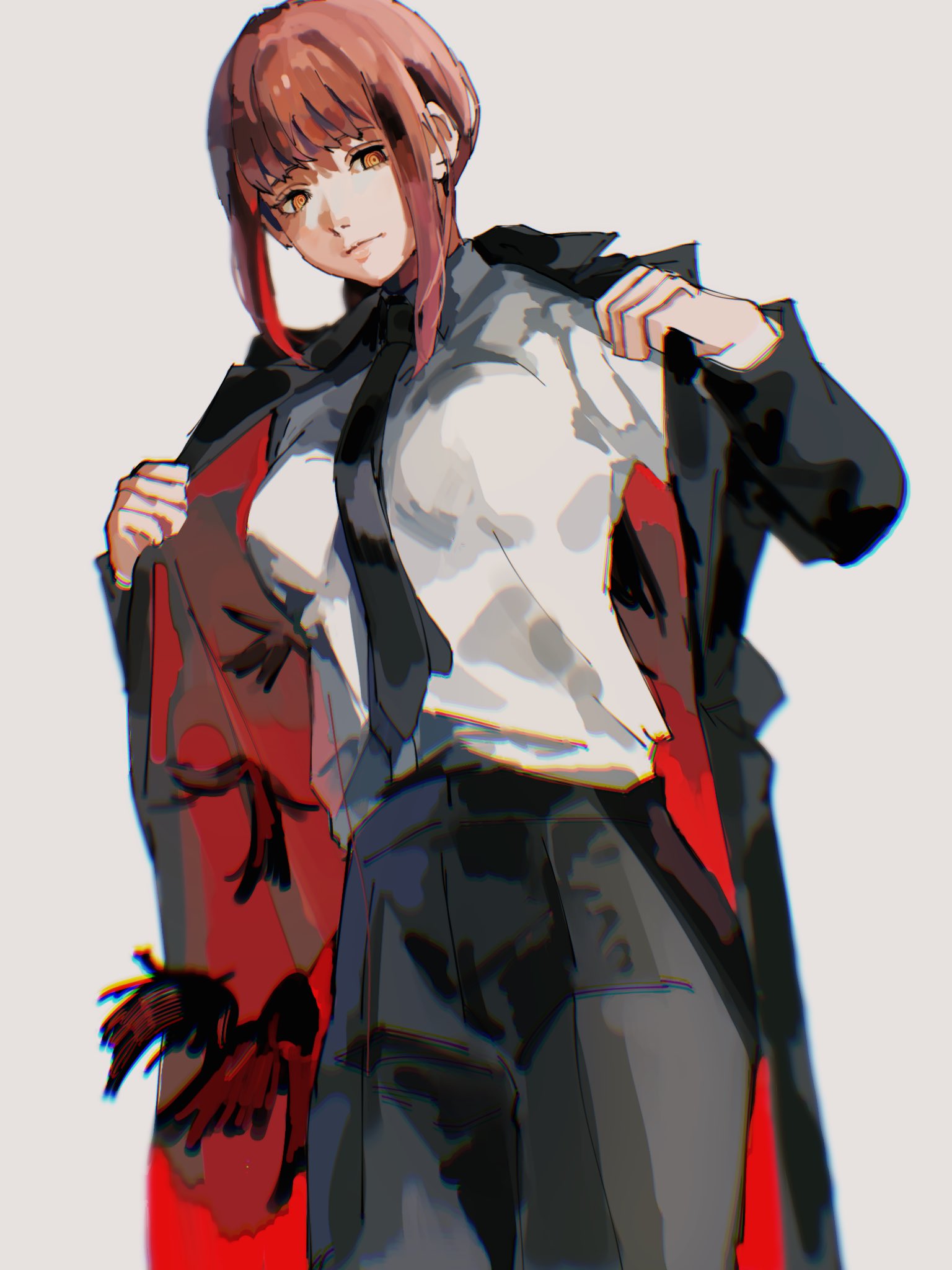 1girl 4me3ba_niku black_coat black_necktie black_pants chainsaw_man closed_mouth coat commentary_request highres long_hair makima_(chainsaw_man) necktie pants red_hair ringed_eyes shirt sidelocks simple_background solo trench_coat white_background white_shirt yellow_eyes