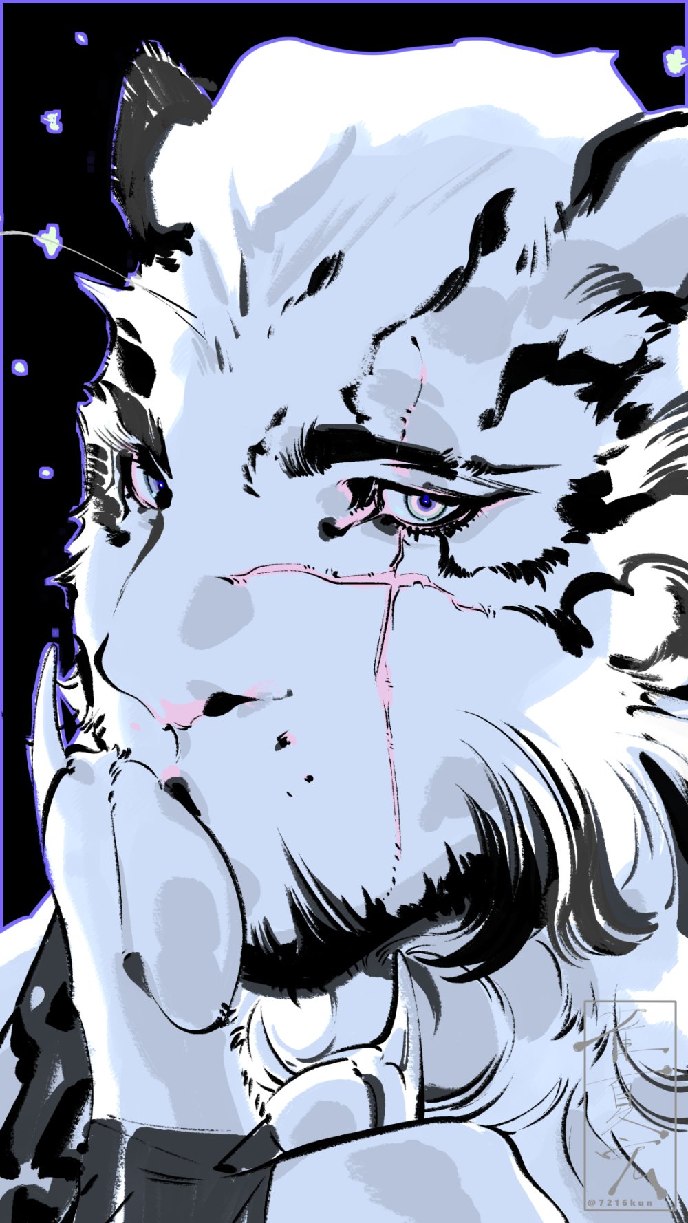 1boy 7216kun animal_ears arknights artist_name chain chain_necklace claws commentary english_commentary facial_scar finger_to_mouth furry furry_male highres jewelry looking_at_viewer male_focus mountain_(arknights) necklace pawpads scar scar_across_eye scar_on_cheek scar_on_face tiger_boy tiger_ears tiger_stripes upper_body