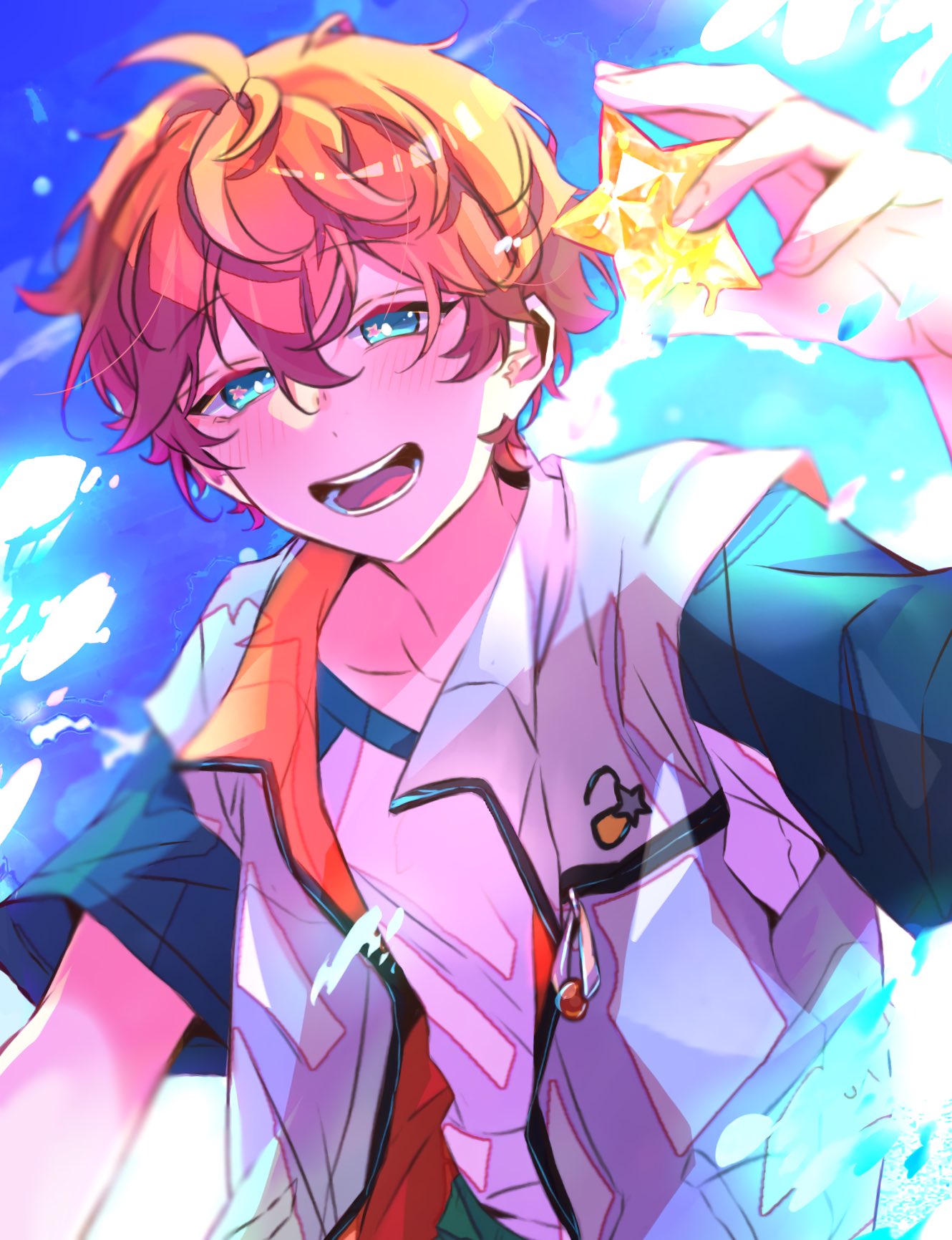 1boy akehoshi_subaru blue_eyes blue_sky commentary ensemble_stars! hair_between_eyes highres holding holding_star looking_at_viewer male_focus open_clothes open_mouth open_vest orange_hair short_hair short_sleeves sky smile solo star_(symbol) teeth two-tone_shirt upper_body vest yosuo_0408