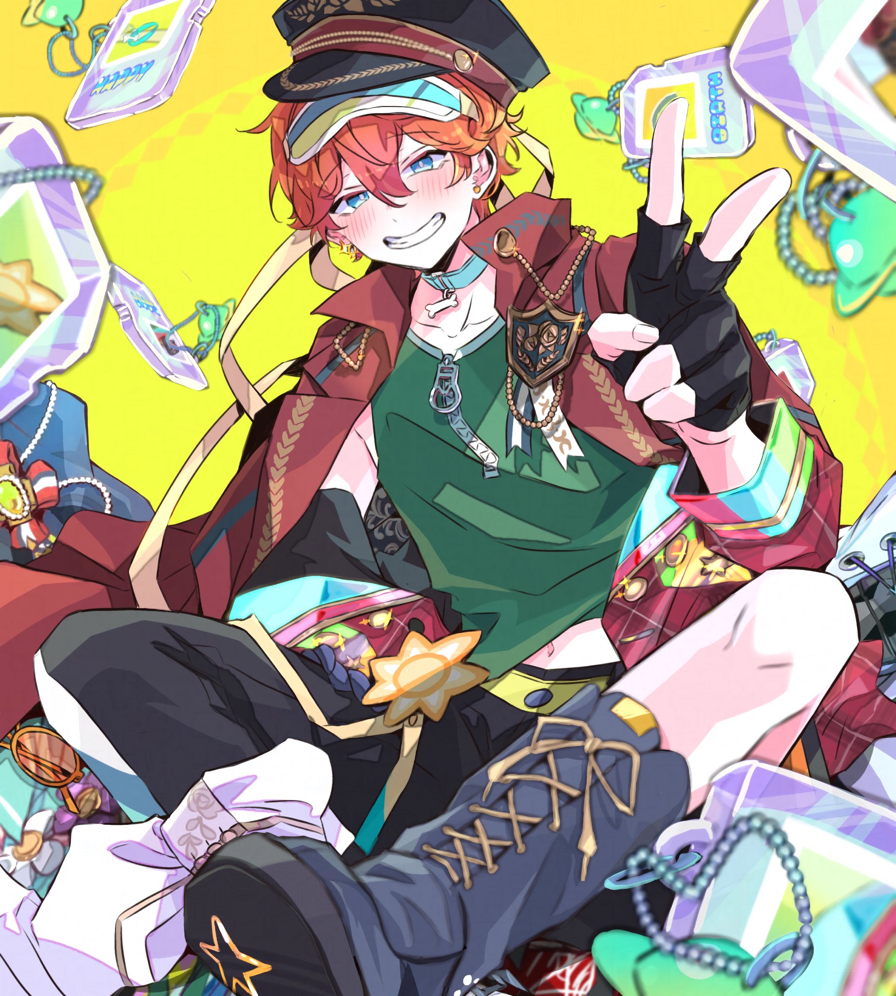 1boy akehoshi_subaru aqua_choker black_gloves black_hat blue_eyes blush boots choker ensemble_stars! fingerless_gloves gloves green_shirt grin hair_between_eyes hat highres jacket long_sleeves male_focus midriff_peek multiple_hats orange_hair peaked_cap red_jacket shirt short_hair sitting smile solo v visor_cap yosuo_0408