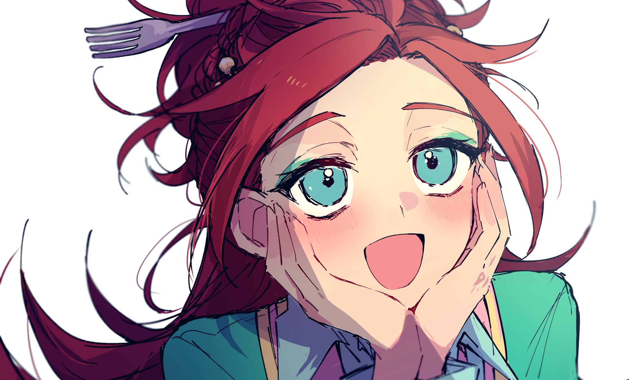 1boy aqua_eyes aqua_eyeshadow blush commentary eyeshadow fork_hair_ornament head_on_hands highres long_hair makeup male_focus natsuneco_02 open_mouth parted_bangs red_hair rielle_corallia simple_background smile solo twisted_wonderland upper_body white_background