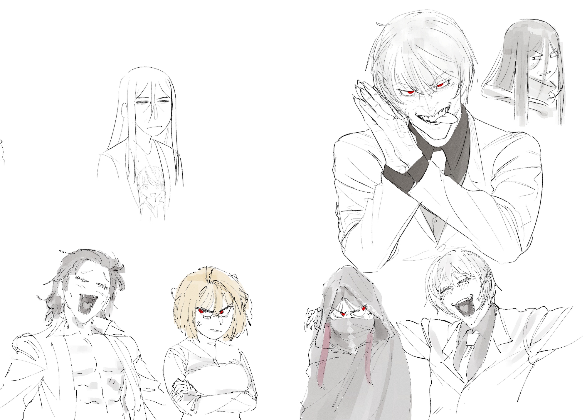 2girls 3boys ahoge anger_vein annoyed antenna_hair arcueid_brunestud arm_around_shoulder black_hair black_shirt blonde_hair blush closed_eyes collared_shirt crossed_arms fangs fate/strange_fake fate_(series) flat_escardos formal_clothes hair_between_eyes hair_intakes hair_slicked_back highres hood jester_karture jewelry leodot long_hair long_sidelocks looking_at_another lord_el-melloi_ii mask meme michael_roa_valdamjong mouth_mask multicolored_hair multiple_boys multiple_girls necklace necktie no_name_assassin_(fate) open_clothes open_shirt parted_bangs pectorals red_eyes red_streaks scowl shirt short_hair sidelocks sketch smile streaked_hair suit sweater t-shirt tongue tongue_out trait_connection tsukihime tsukihime_(remake) turtleneck turtleneck_sweater vampire waver_velvet zesty_sonic_(meme)