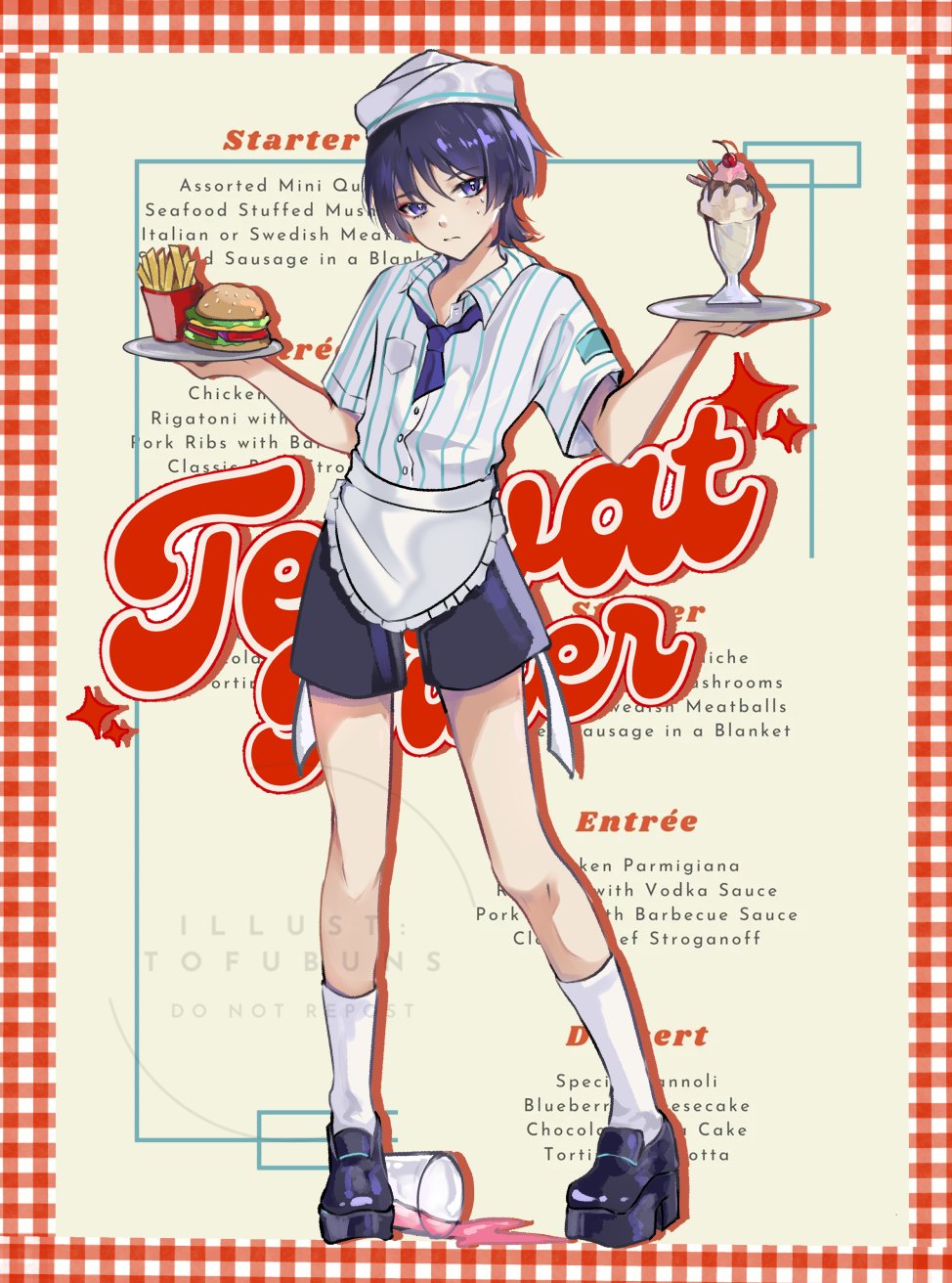1boy alternate_costume apron black_shoes black_shorts blue_necktie burger closed_mouth diner english_text food french_fries full_body genshin_impact hat highres holding holding_tray loafers looking_at_viewer maid_apron male_focus milkshake necktie purple_eyes purple_hair scaramouche_(genshin_impact) shirt shoes short_hair shorts socks solo tofuubuns tray wanderer_(genshin_impact) white_shirt white_socks