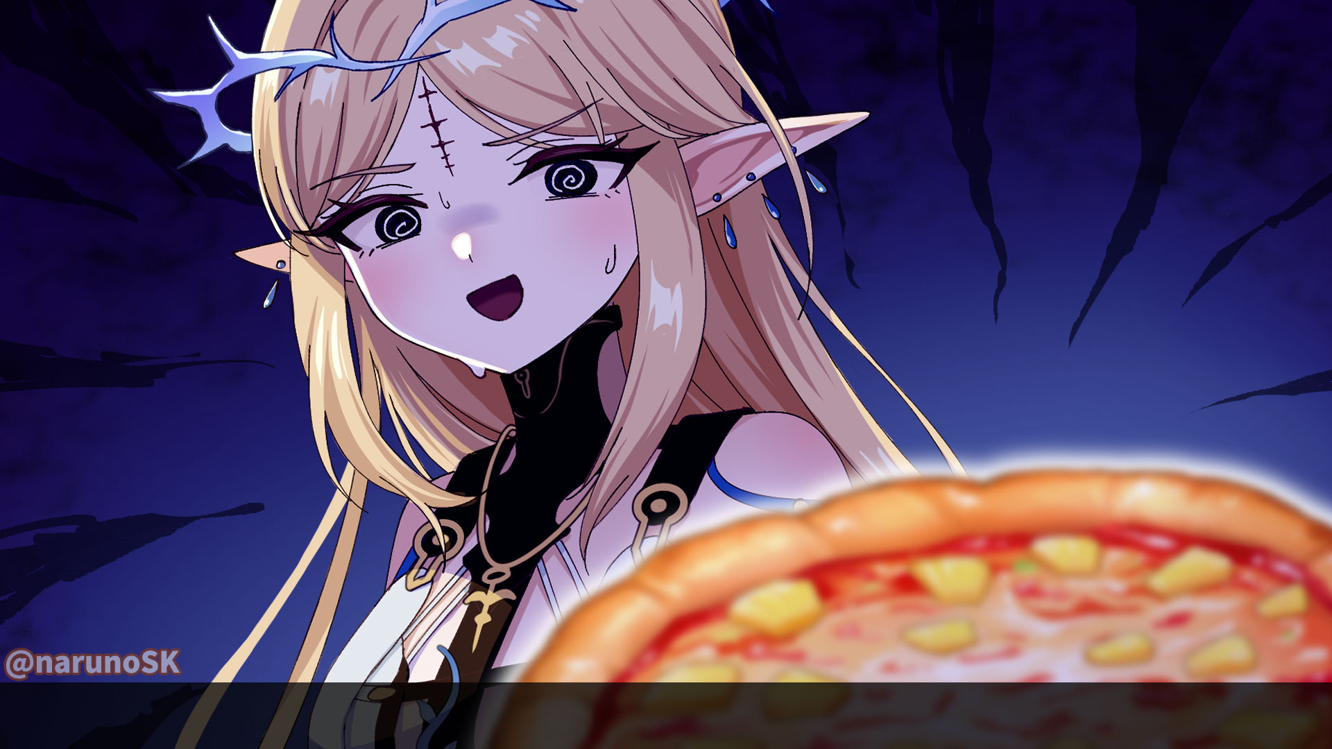 1girl @_@ bare_shoulders blonde_hair blue_eyes breasts canon_event cartethyia_(wuthering_waves) commentary commentary_request earrings english_commentary highres jewelry long_hair looking_at_food mixed-language_commentary multiple_earrings naruno_suke_(narunosk) nervous_smile open_mouth parted_bangs parted_lips pineapple_on_pizza pointy_ears portrait small_breasts smile solo sweatdrop tacet_mark_(wuthering_waves) wuthering_waves