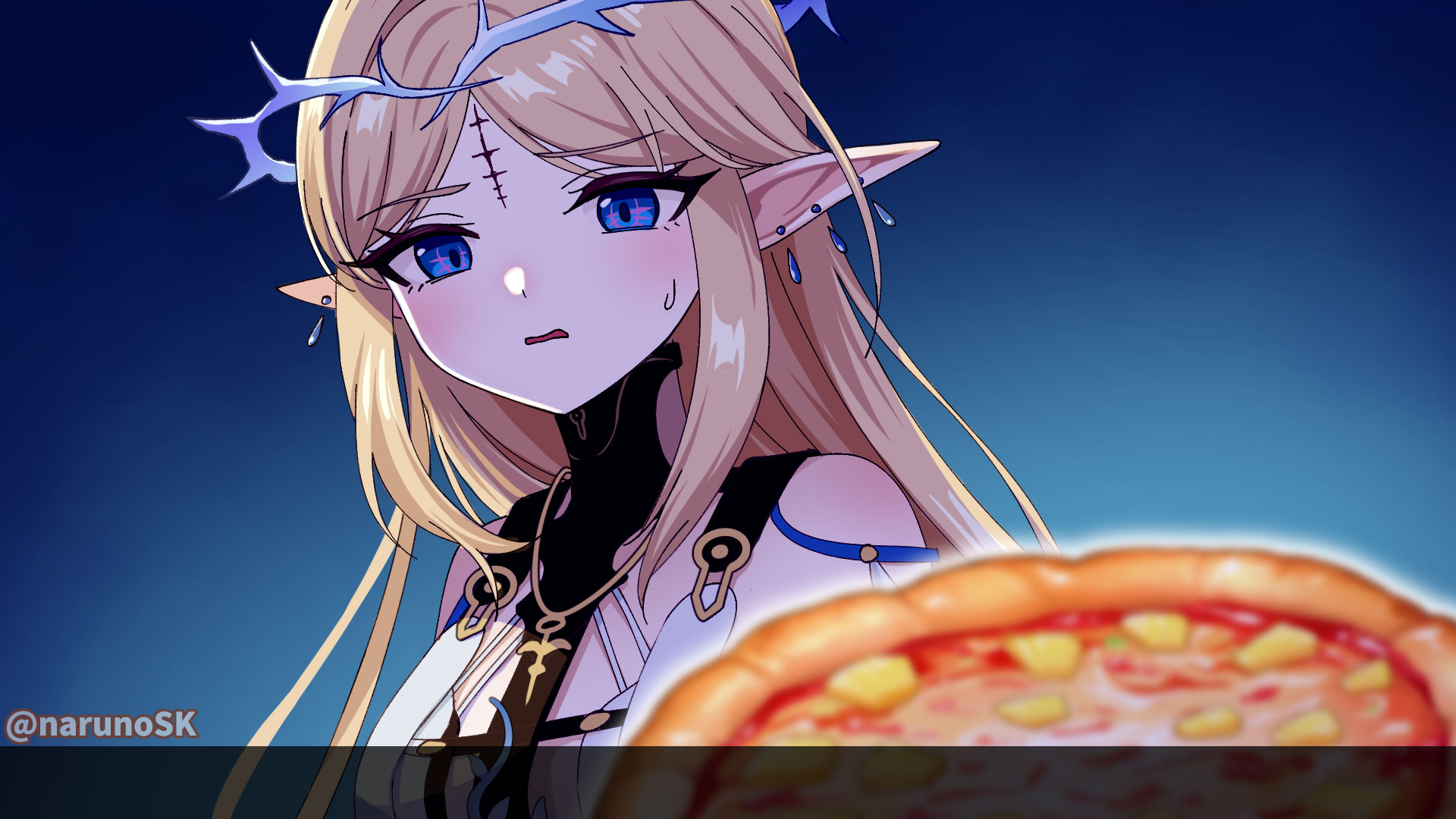 1girl bare_shoulders blonde_hair blue_eyes breasts canon_event cartethyia_(wuthering_waves) commentary commentary_request earrings english_commentary highres jewelry long_hair looking_at_food mixed-language_commentary multiple_earrings naruno_suke_(narunosk) parted_bangs parted_lips pineapple_on_pizza pointy_ears portrait small_breasts solo sweatdrop tacet_mark_(wuthering_waves) wuthering_waves